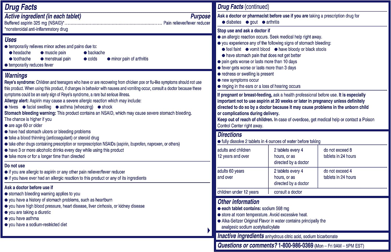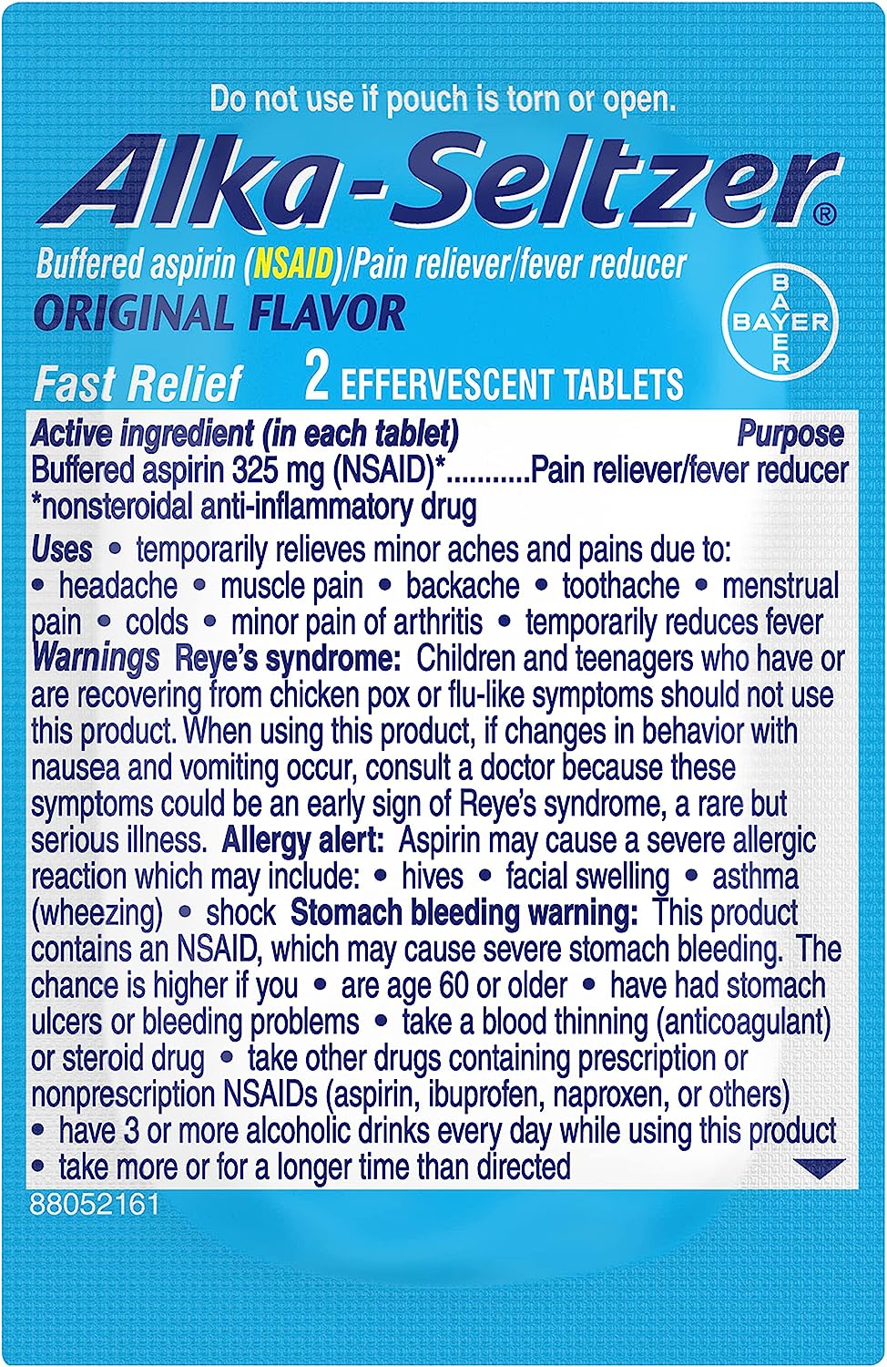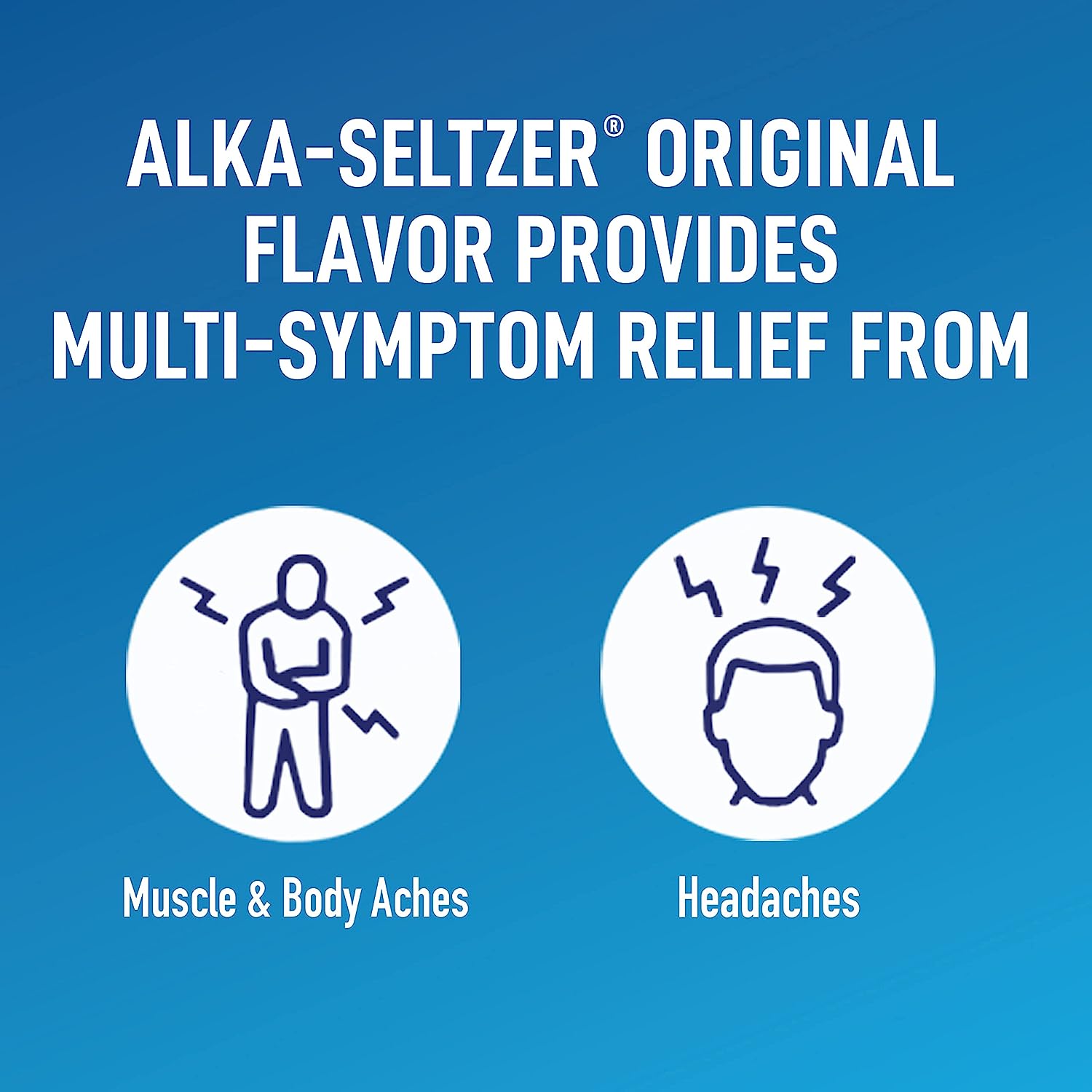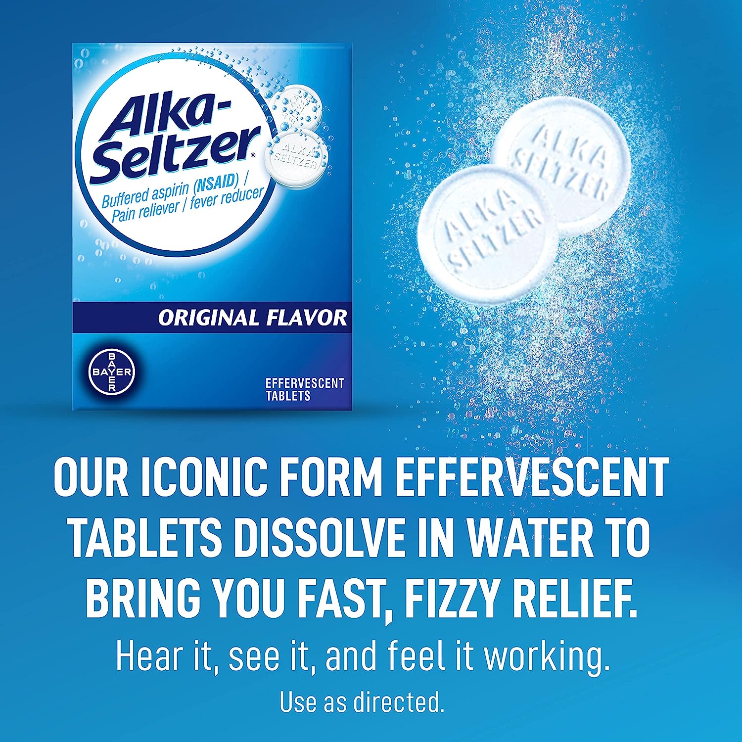 From a trusted brand for over 90 years, Alka-Seltzer Original Flavor Effervescent Tablets provide fast, fizzy, refreshing relief. Our iconic original effervescent relief tablets quickly dissolve in water to bring you fast, powerful relief where, and when, you need it most. Alka-Seltzer fizzy tablets provide a fizzy format to bring you multi-symptom relief of headache, backache, body ache, and muscle pain so you can say yes to life. With the active ingredient buffered aspirin, just 2 effervescent tablets dissolved in water bring you fizzy relief. Alka-Seltzer Original Flavor multi symptom tablets make for fast, convenient, portable relief— from the pantry, to the glove compartment, to your pocket. To use, fully dissolve tablets in 4 ounces of water before taking. Adults and children over 12 years old can take 2 tablets every 4 hours as needed, or as directed by a doctor. Do not exceed 8 tablets in 24 hours. Adults 60+ do not exceed 4 tablets in 24 hours