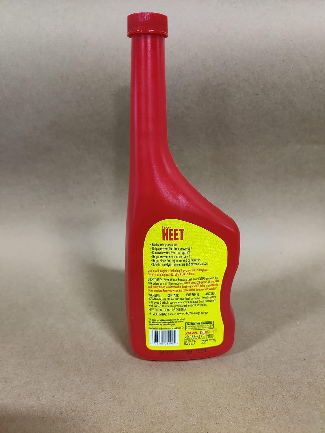Gold Eagle ISO-HEET Premium Fuel-Line Antifreeze, Water Remover & Injector Cleaner is the premium gas-line antifreeze that absorbs up to 5 times the water of regular gas dryers. It is designed for year round use in all 2 and 4 cycle gas and diesel engines. ISO-HEET prevents rust and corrosion by getting the water out. This anti-freeze can be used with every fill up in below freezing temperatures or whenever you want to absorb water from gas or diesel fuel. This product comes in an easy pour 12 ounce bottle. Usage Directions: Twist off cap. Puncture seal. Pour ENTIRE contents into tank before or after filling with fuel. Bottle treats 20 gallons of fuel. Use with every fill-up in winter, and at least every 5,000 miles in summer to clean injectors. Removes water and condensation in warm, wet weather.