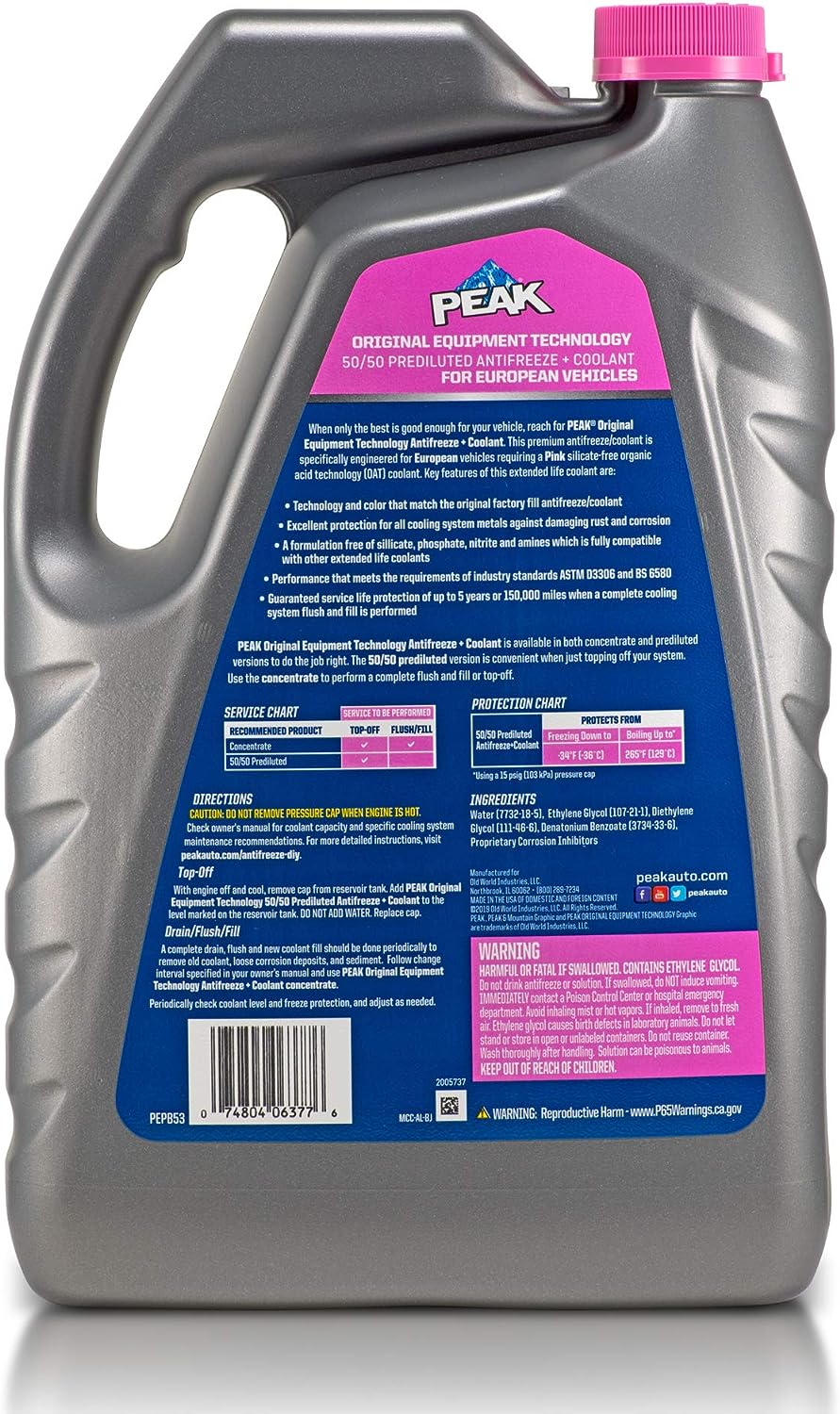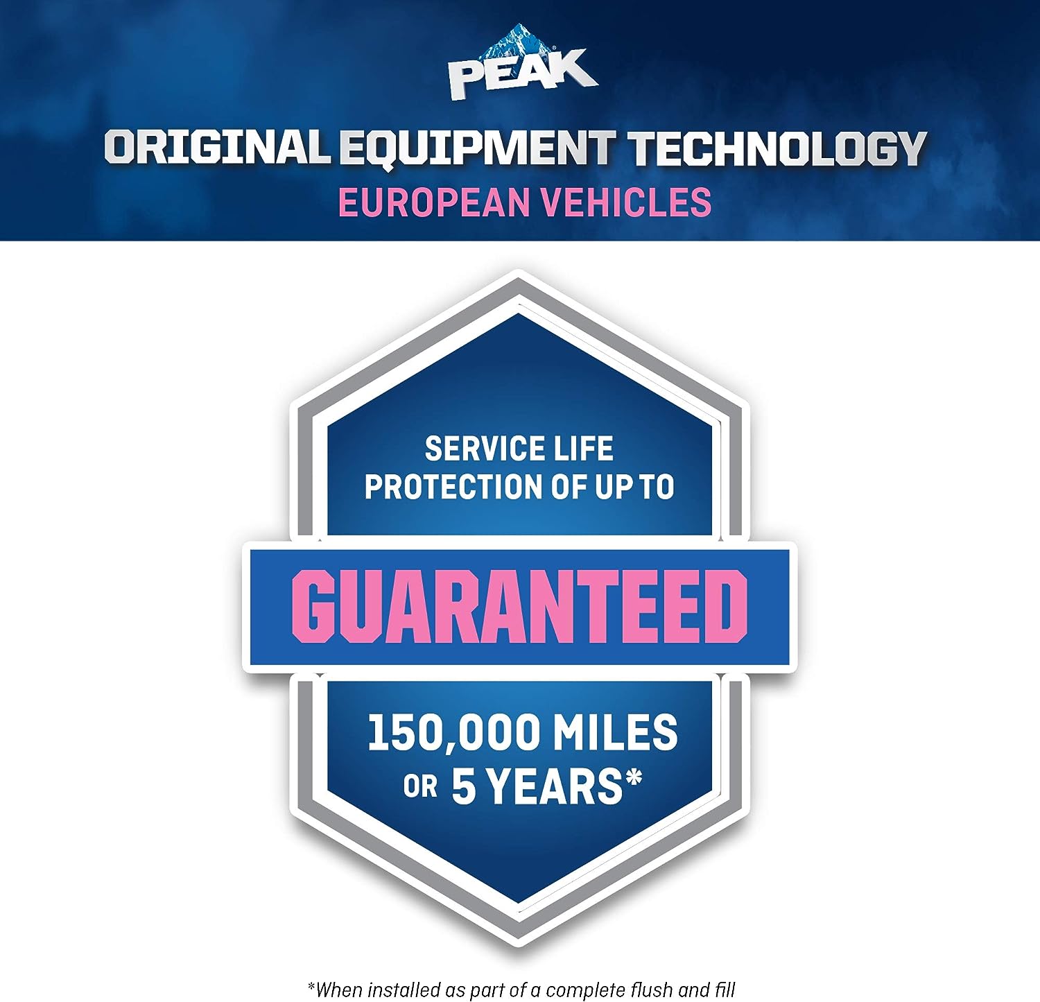 • GUARANTEED: When installed as part of a complete flush and fill, PEAK guarantees this coolant will provide service life protection of up to 150,000 miles or 5 years.