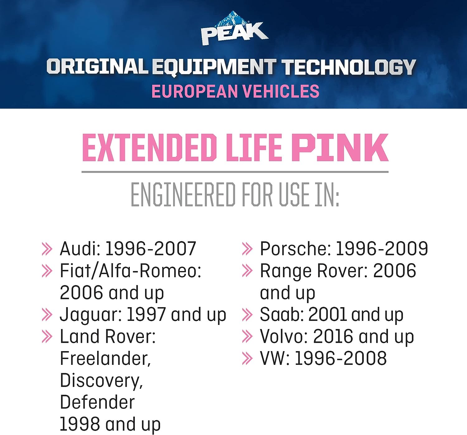 • DESIGNED FOR EUROPEAN VEHICLES: Recommended for use with certain years of Audi, Fiat, Saab, and other European vehicles that require a PINK Silicate-Free Organic Acid Technology (OAT) formula