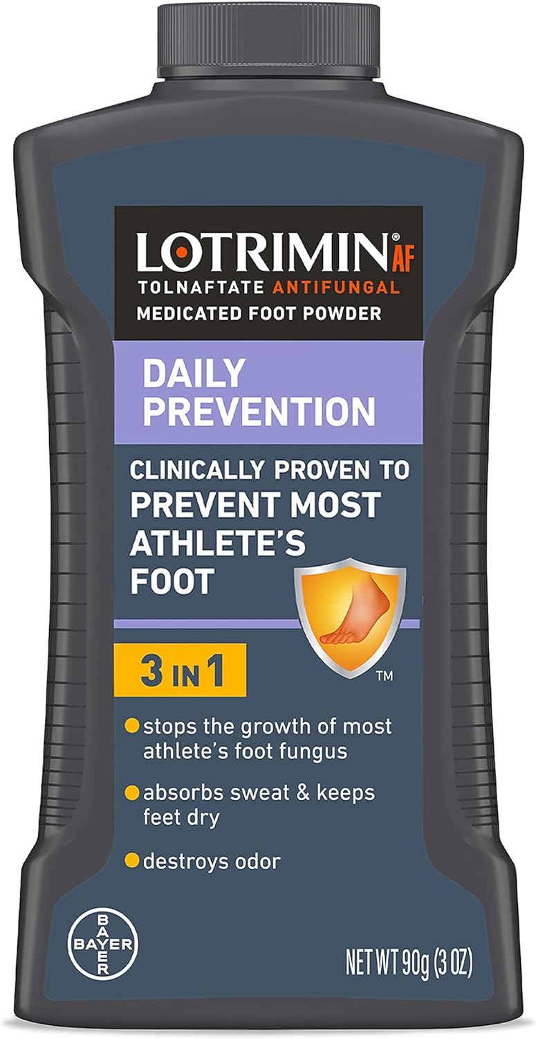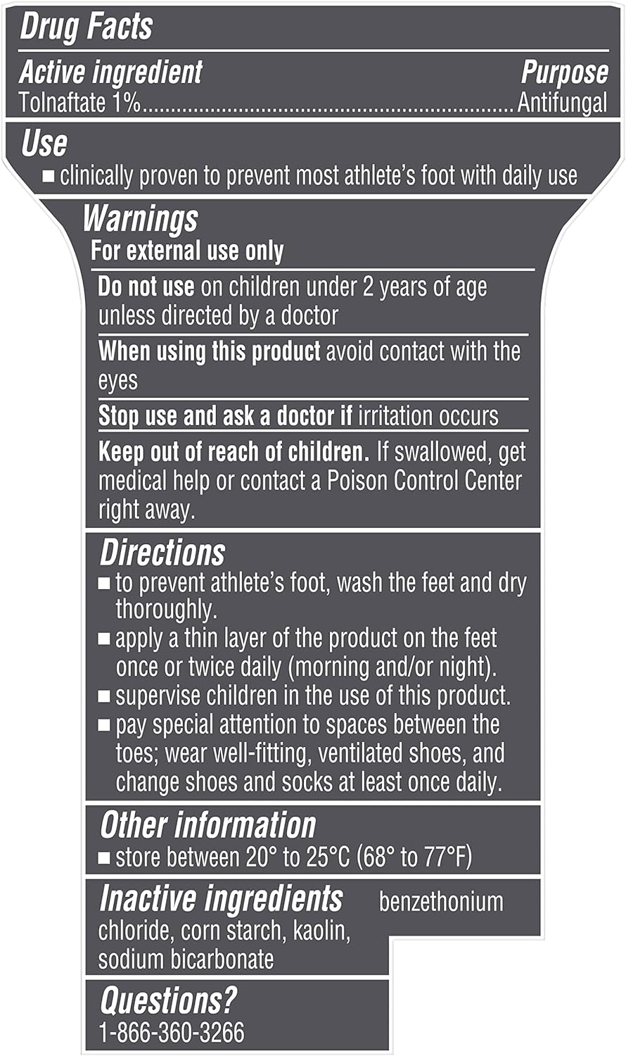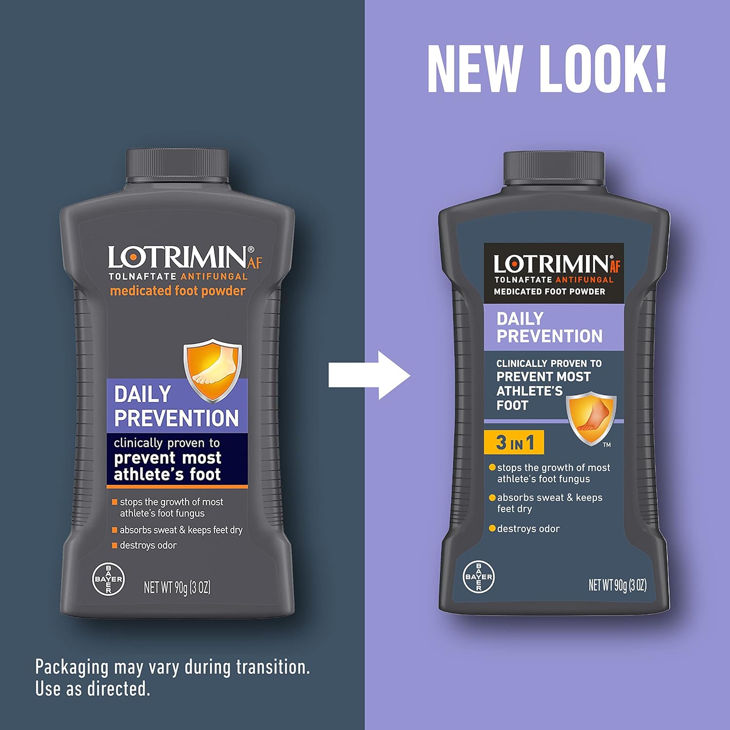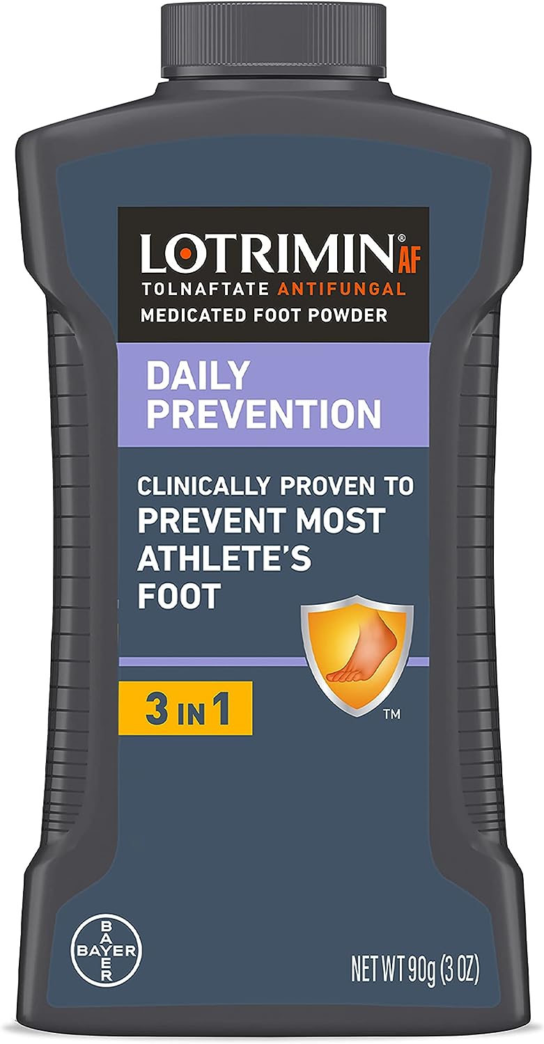 Prevent the uncomfortable itching, burning, cracking, and scaling symptoms of athlete's foot with Lotrimin AF daily prevention Medicated foot powder. It also absorbs sweat, helping to keep your feet dry and destroys odor. The active ingredient in this athlete's foot prevention powder is Tolnaftate, which is clinically proven to prevent most athlete's foot fungus. Prevent and stop the growth of most athlete's foot fungus with the power of Lotrimin AF daily prevention Medicated foot powder - your tinea Pedi's is no match for this prevention product that works to stop the fungus that causes athlete's foot. Safe for kids over 2. Use as directed.