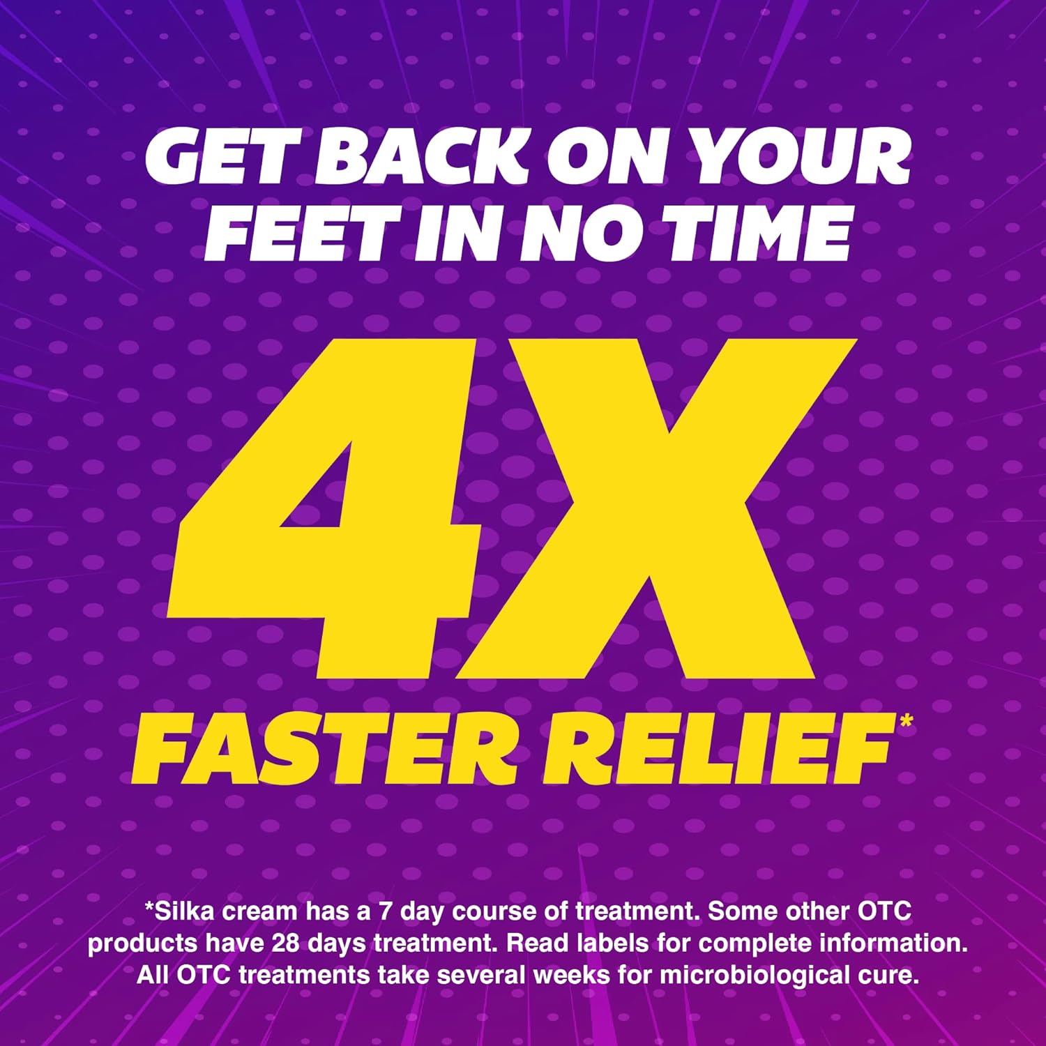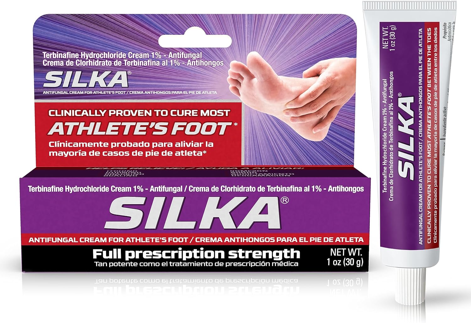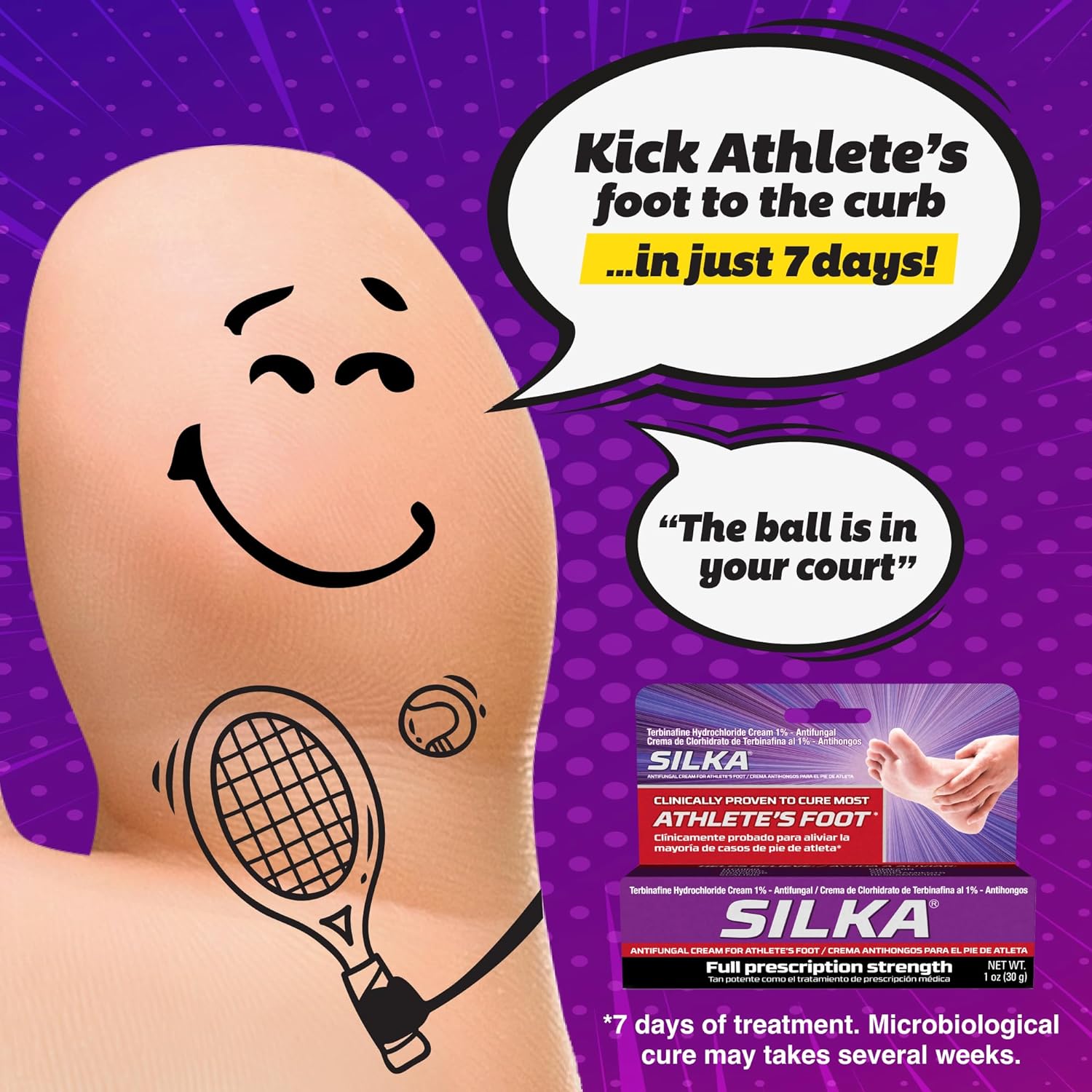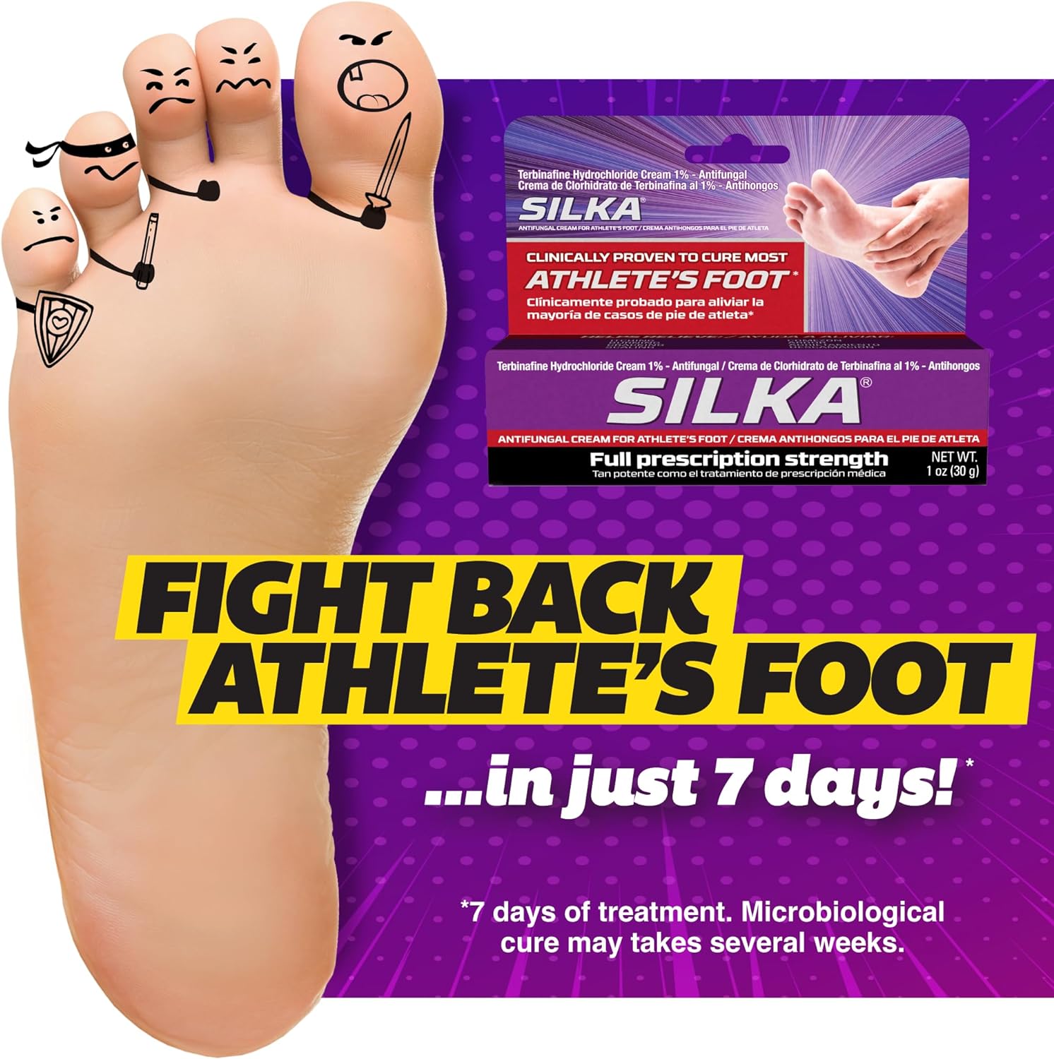 Kick athlete's foot to the curb with Silka Anti-Fungal Cream, a topical antifungal cream with an advanced formula that starts to work on the first day. Formulated with 1% Terbinafine Hydrochloride, which is a maximum strength OTC antifungal formula, this foot fungus treatment cream provides immediate relief from the itching, burning, cracking, and scaling associated with the athlete's foot (tinea pedis), jock itch (tinea cruris), or ringworm (tinea corporis). Wash affected skin with soap and water and dry completely before applying the anti fungal cream. If applying between the toes only, apply twice a day for 1 week. On the bottom or sides of the foot, apply twice a day for 2 weeks, and for jock itch and ringworm, apply once a day for 1 week. Recover your confidence while doing your daily activities with this 7-day treatment for athlete's foot. A complete cure may take several weeks.