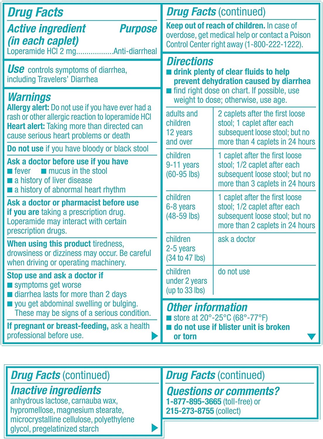 • Each anti-diarrhea medicine caplet contains 2 milligrams of loperamide hydrochloride to help control symptoms of diarrhea due to acute, active and Traveler's diarrhea