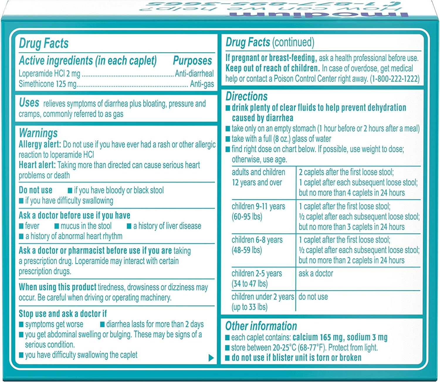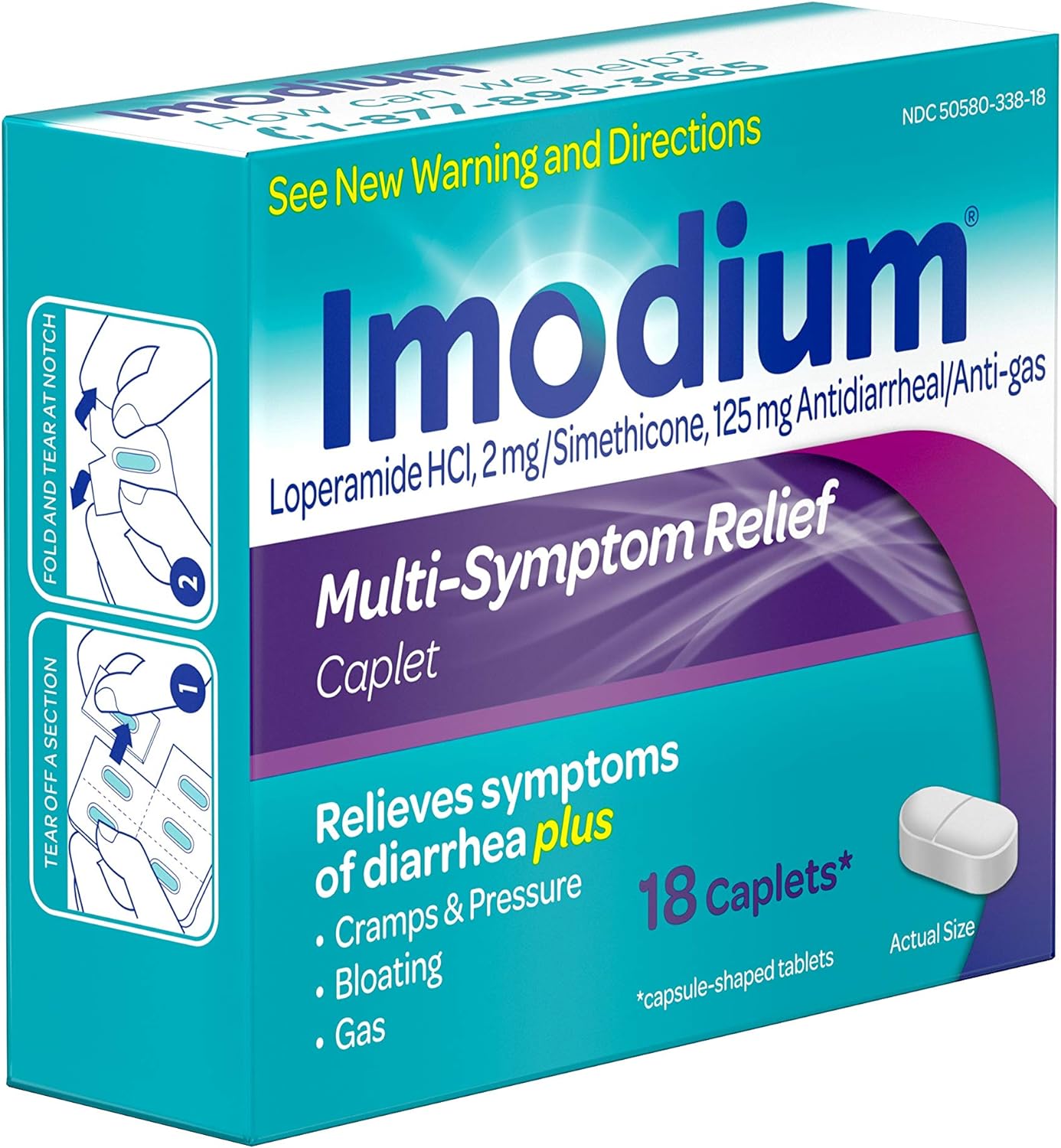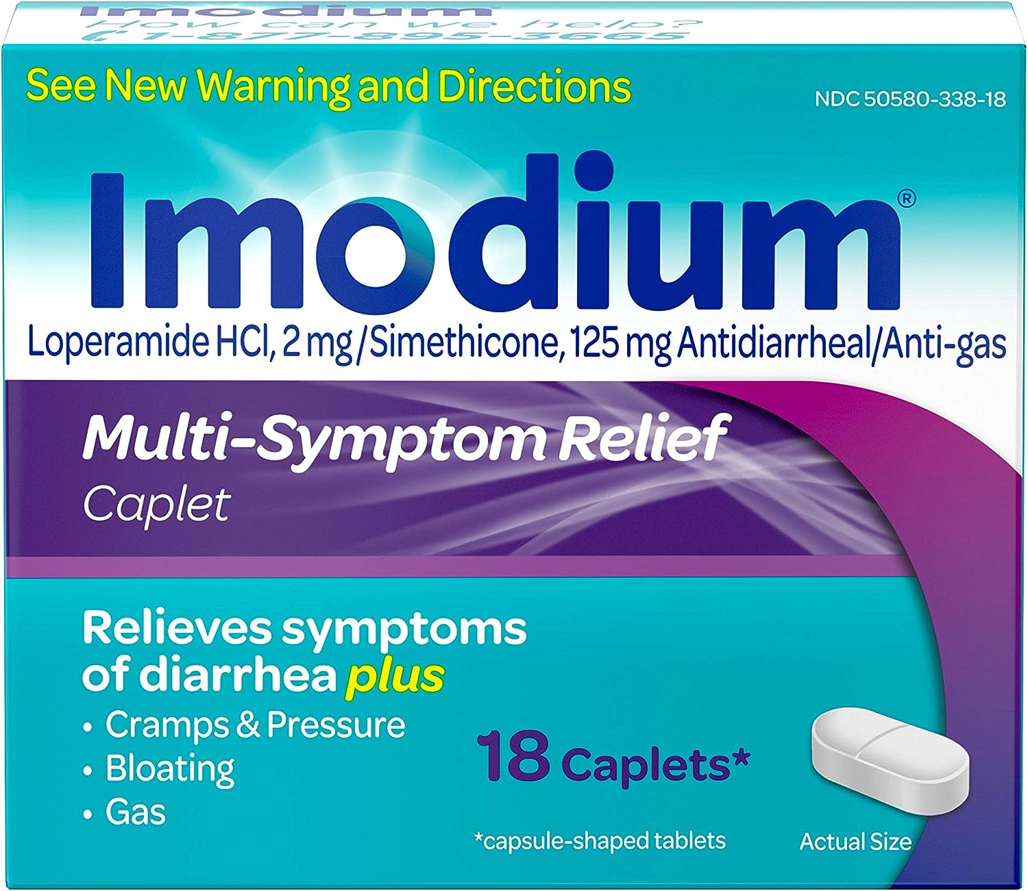 Imodium Multi-Symptom Relief Caplets are the only over-the-counter brand of anti-diarrheal medicine that combines two powerful medicines to relieve symptoms of diarrhea, as well as gas, cramps, pressure and bloating. Each caplet contains 2 milligrams of loperamide hydrochloride to help relieve diarrhea, and 125 milligrams of simethicone to help other associated symptoms such as gas, bloating and cramps. From the #1 doctor-recommended brand of anti-diarrheal products, the proven formula works with your body to slow down your system and helps restore the natural rhythm of your digestive system. Intended for adults and children ages 12 and older, this multi-symptom diarrhea medicine effective relief and is ideal for use anywhere, both at home or on-the-go.