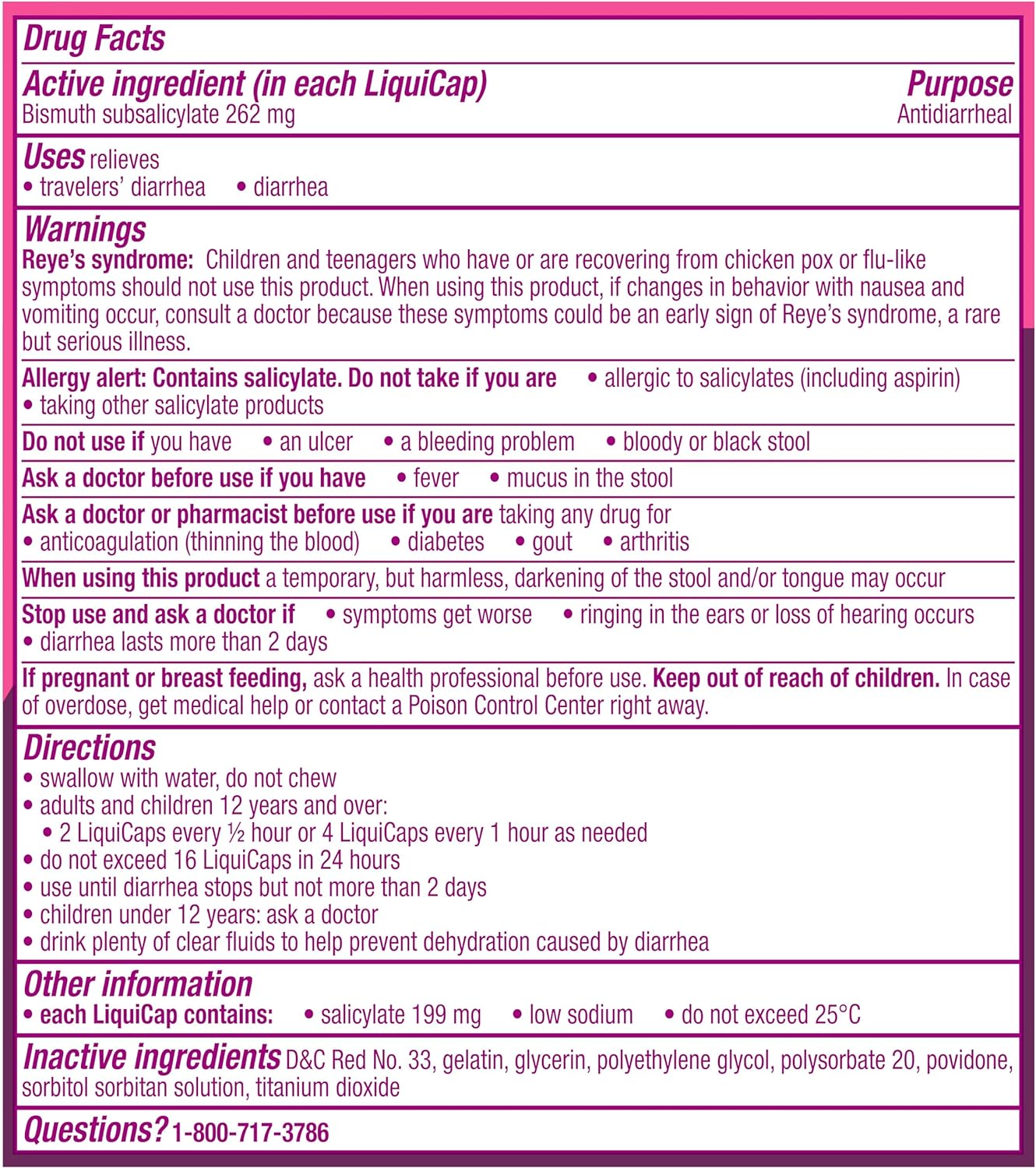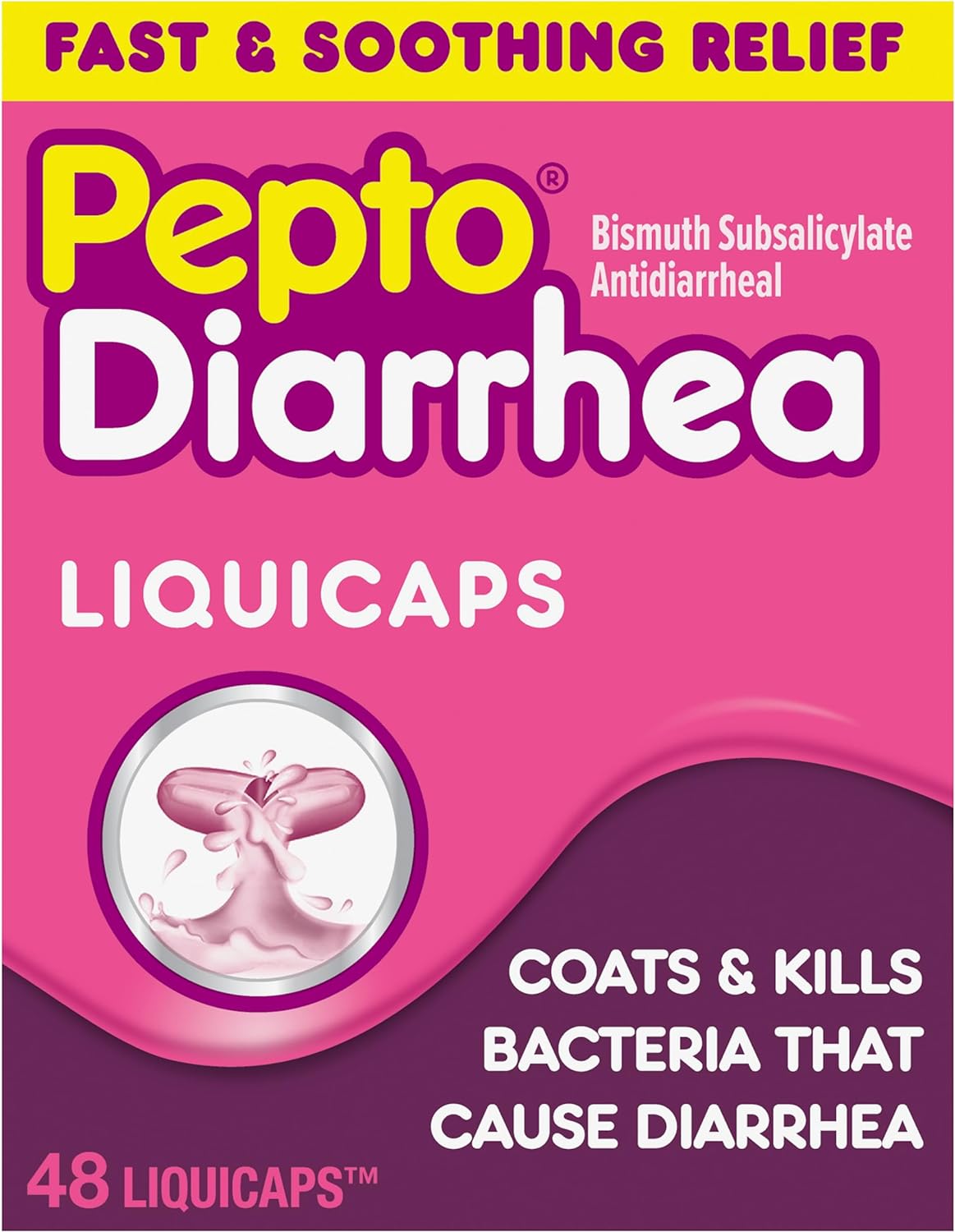 Pepto Bismol Diarrhea LiquiCaps, Anti Diarrhea Medicine for Fast Diarrhea Relief, Antidiarrheal Liquid Pills. Bacteria is a leading cause of diarrhea, and it can come from the food that you eat! Pepto Diarrhea LiquiCaps gets to the source with its dual action formula that coats your stomach and kills bacteria that causes diarrhea. When left untreated, bad bacteria can continue to grow. Pepto Diarrhea LiquiCaps over-the-counter medicine provides fast diarrhea relief by treating diarrhea at the source. Pepto Diarrhea LiquiCap pills are equally as effective as Pepto Diarrhea Liquid. This convenient and easy to use form allows you to take it on-the-go so you can travel worry-free! Take Pepto Diarrhea at the first sign of diarrhea so you can get relief! From the maker of the #1 Pharmacist Recommended Upset Stomach Brand – Pepto Bismol. As a part of the P&G family, Pepto Bismol has high quality standards for all our products. Pepto Bismol has been a trusted brand for the treatment of upset stomachs for over 100 years. *May be HSA/ FSA eligible. *Based on Pharmacy Times 2022 Survey-upset stomach remedies category