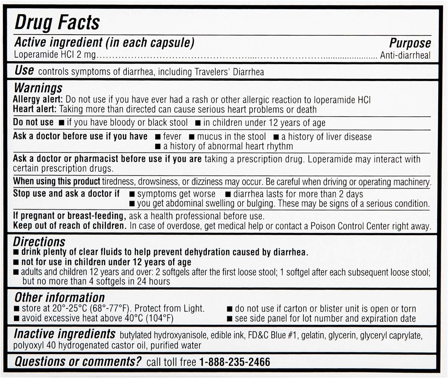 • Each softgel capsule contains 2 milligrams of loperamide hydrochloride to aid in control of symptoms of diarrhea due to acute, sudden, active, and traveler's diarrhea