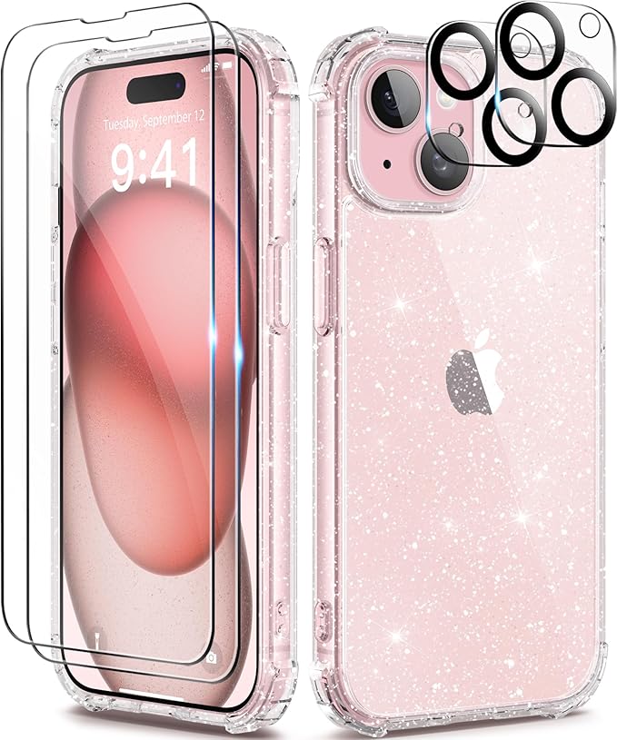 5 in 1 Compatible with iPhone 15 Case Glitter, with 2X Screen Protector + 2X Camera Lens Protector, [Non-Yellowing] Clear Sparkle Slim Shockproof Phone Cover for Women 6.1 Inch, Shiny Clear