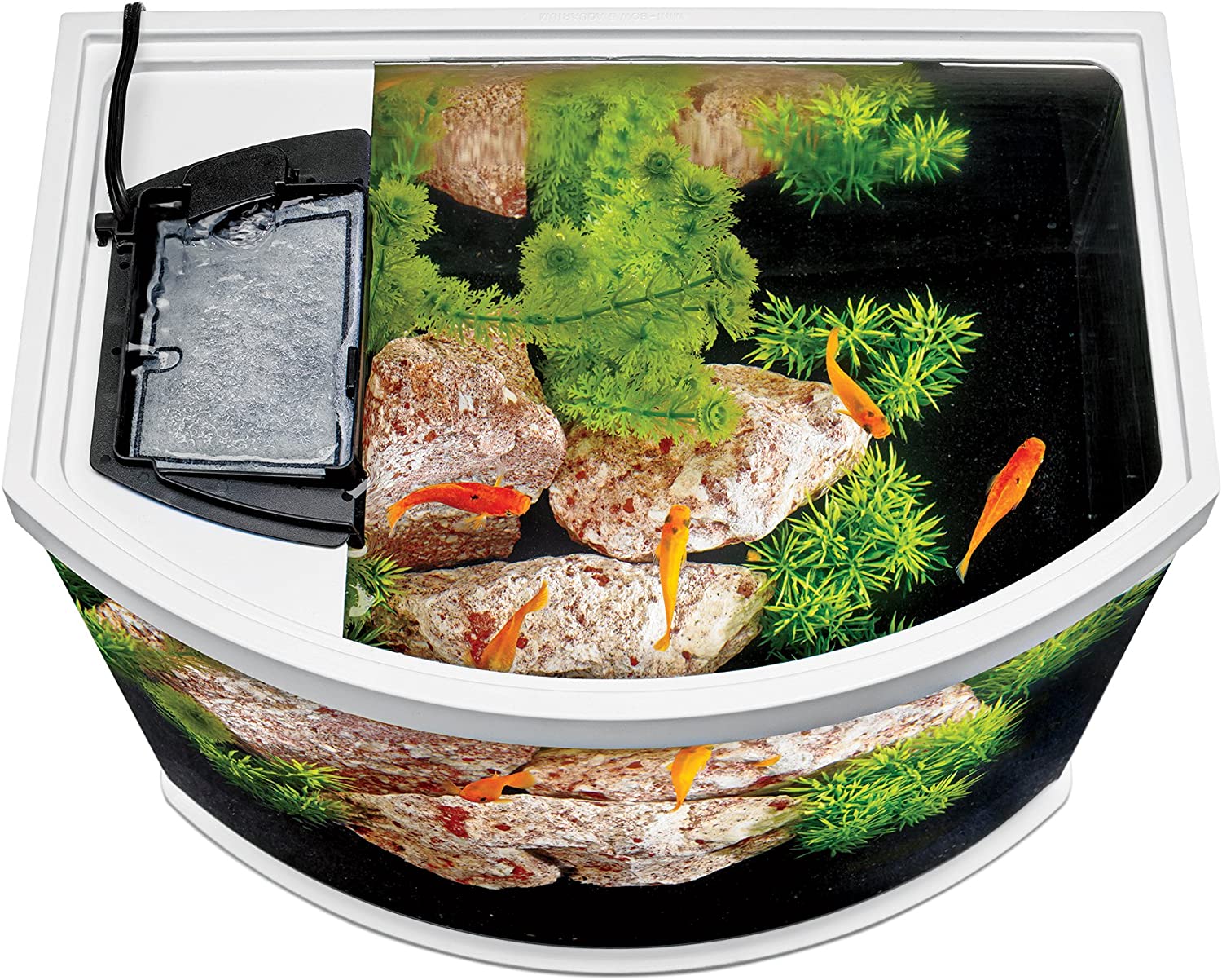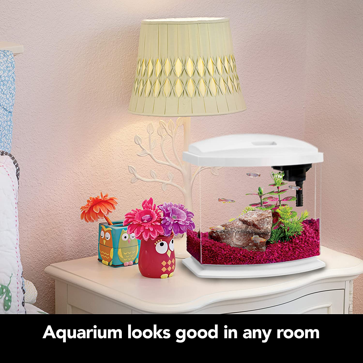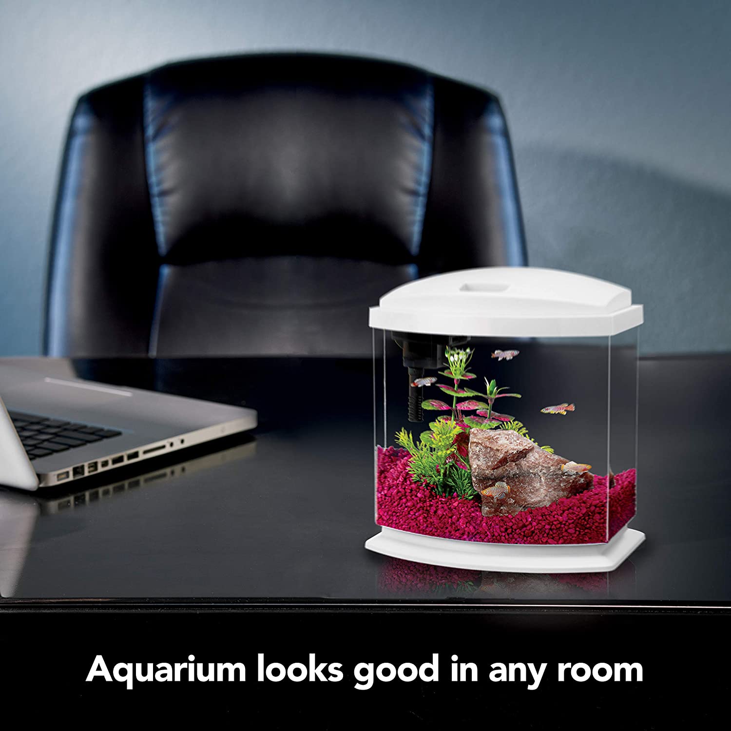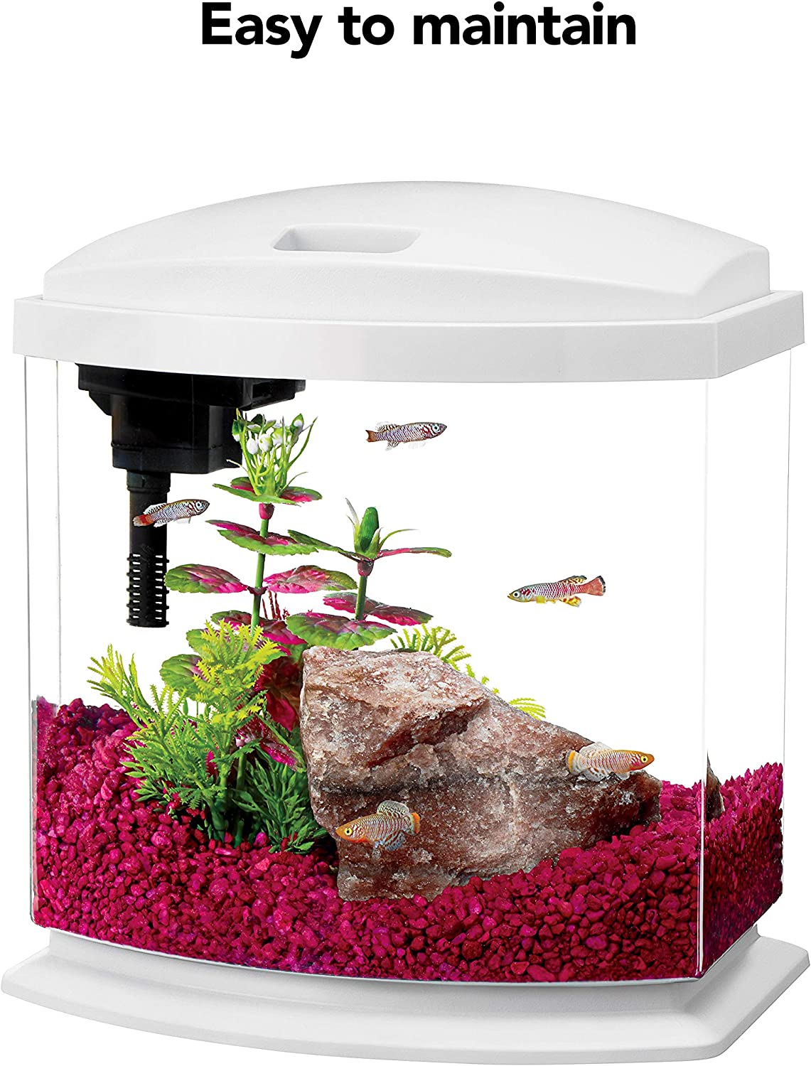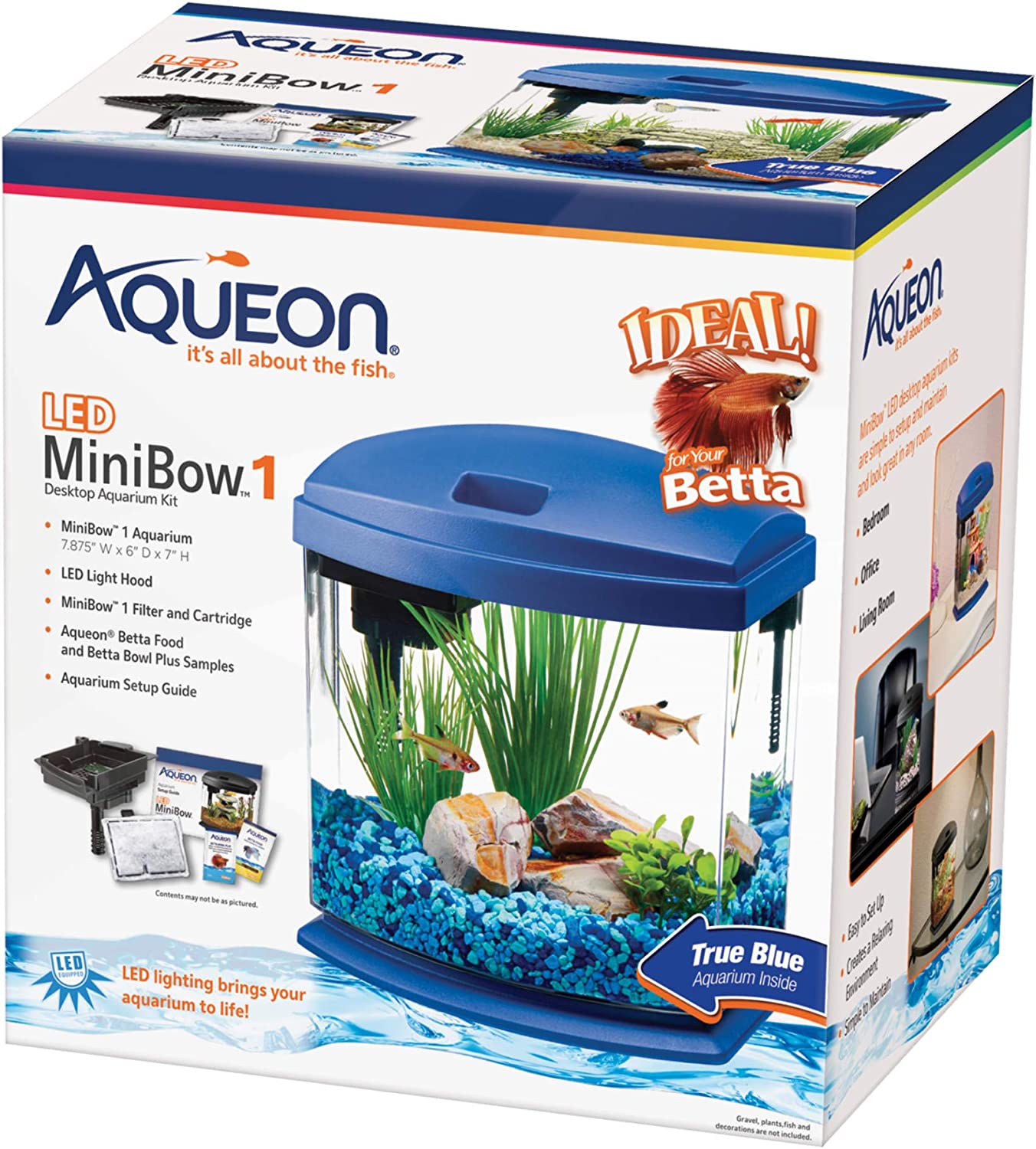 For many people, their first experience in the aquatic hobby is with a betta. These habitats no longer need to be a simple bowl - Aqueon offers LED lighting inside a betta habitat that is attractive, stylish and will get a beginner or experienced aquarist started off on the right foot. The compact size makes the aquarium great for use in smaller spaces, such as a desktop or dorm room. Each LED MiniBow kit contains Aqueon Quiet Flow filtration, food and water care samples and a complete setup guide designed to walk you through the process of proper aquarium set-up. Fish, gravel and décor are sold separately. Made in the USA.