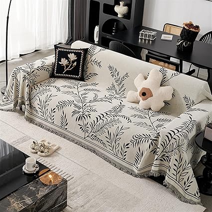Chenille Sofa Throw Blanket Willow Leaves Sofa Towel Sofa Cover 1/2/3/4 Seaters Sofa Throw L/U Shape Tassels Decorative Sofa Slipcover Warm Thick Armchair Cover Blanket(Black, 180X130cm)