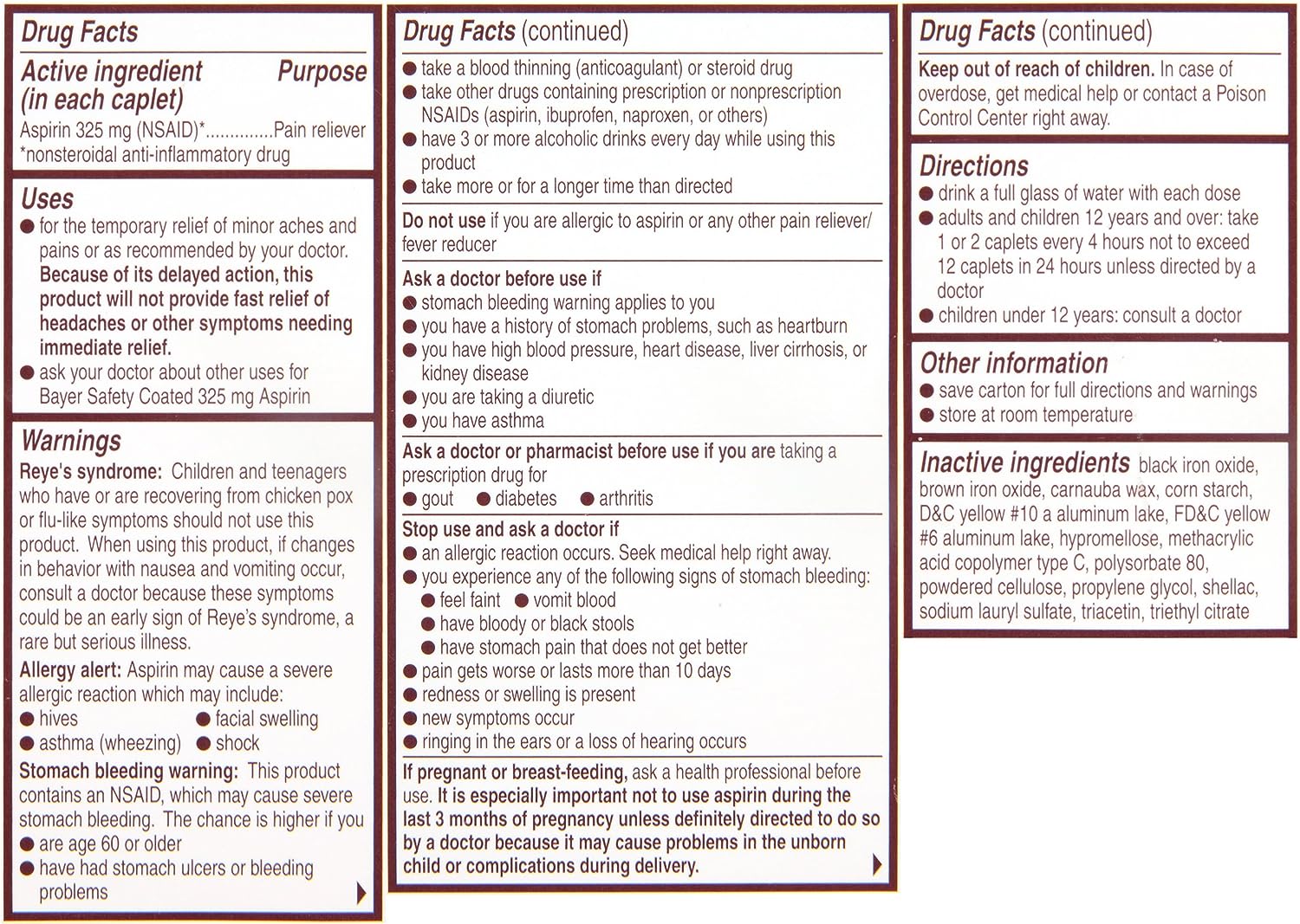 Aspirin Regimen Bayer 325mg is intended for the temporary relief of minor aches and pains as recommended by your doctor. Because of its delayed action, this product will not provide fast relief of headaches or other symptoms needing immediate relief. Ask your doctor about other uses for Bayer Safety Coated 325mg Aspirin.