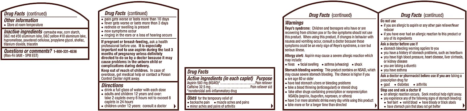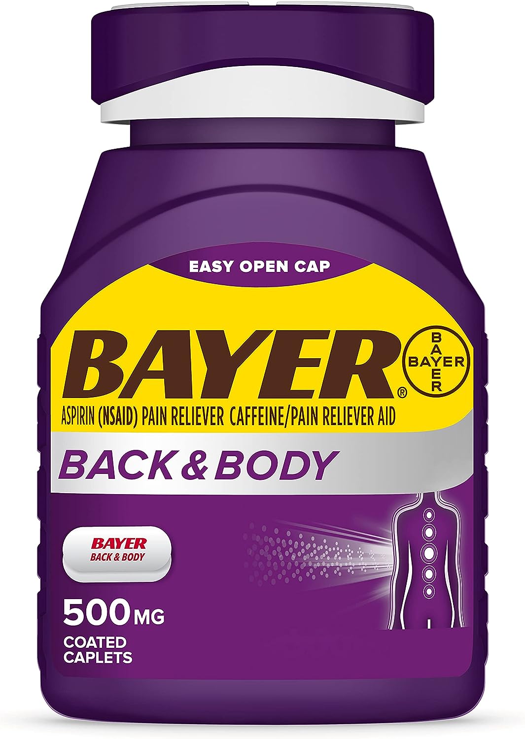 For 125 years, Bayer Aspirin has been a leading aspirin brand in pain relief. Bayer Back and Body Extra Strength Aspirin is a powerful pain reliever with a dual action formula containing 500mg aspirin and 32.5mg of caffeine to help boost the pain-relieving effects of aspirin. These extra strength back and body pain relief pills provide safe, proven pain relief, when taken as directed, at the site of backache and muscle aches/pain. Each 500mg aspirin tablet is coated for ease of swallowing and is free of sodium. Adults and children over 12 take 1 or 2 caplets every 6 hours with a full glass of water, not exceeding 8 caplets in a 24-hour period. Use as directed.