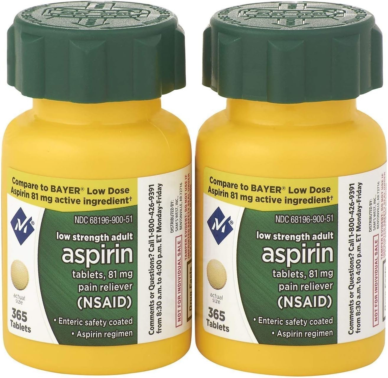 Sam's West Member's Mark Low Strength Adults Enteric Safety Coated Aspirin Regimen Tablets Pain Reliever NSAID, 81 mg, 2 Bottles, 730 Tablets