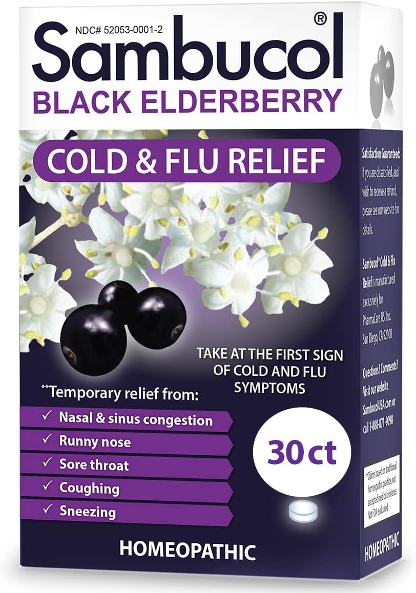 Sambucol Cold and Flu Relief Tablets - Homeopathic Cold Medicine, Nasal & Sinus Congestion Relief, Use for Runny Nose, Sore Throat, Coughing, Cold Remedy for Adults - Black Elderberry, 30 Count