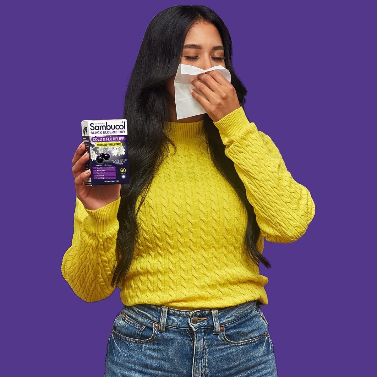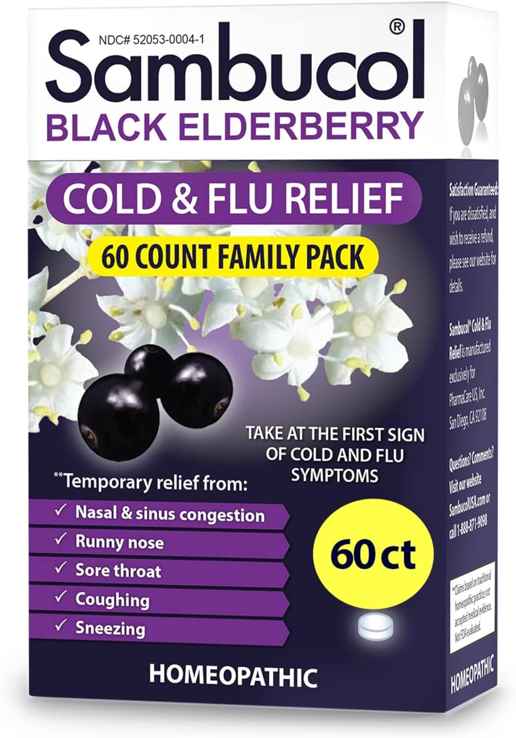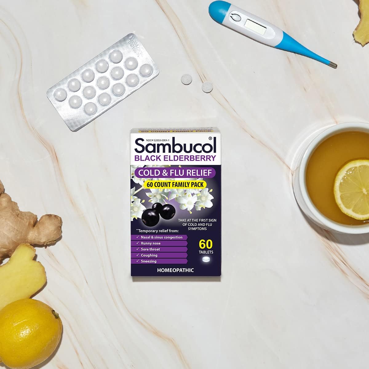 • NON-DROWSY HOMEOPATHIC MEDICINE - Sambucol Black Elderberry tablets are non-drowsy cold and flu relief tablets that are perfect for the whole family. Less than 1g of sugar per tablet
