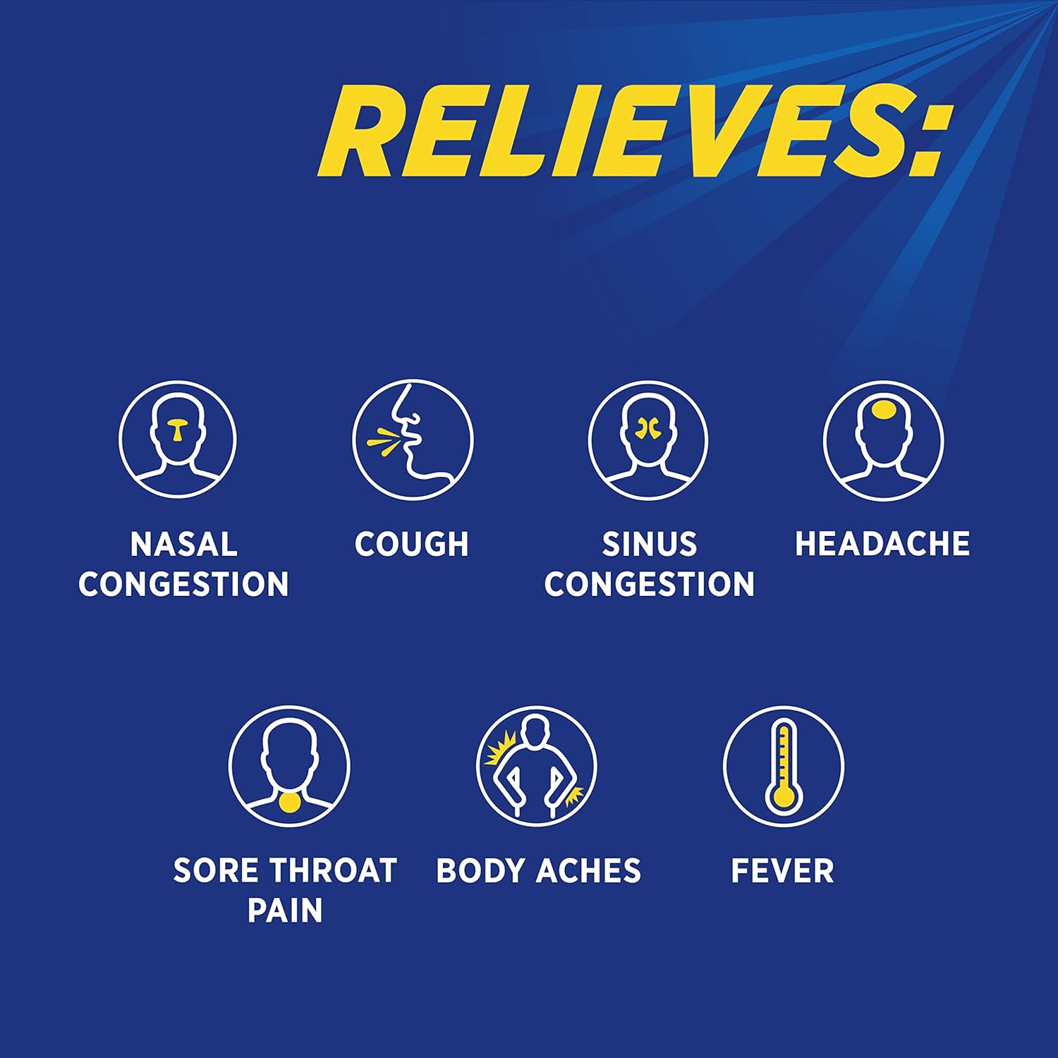 • Powerful relief from cold symptoms such as sore throat pain, headache, minor body aches and pains, nasal and sinus congestion, cough and fever