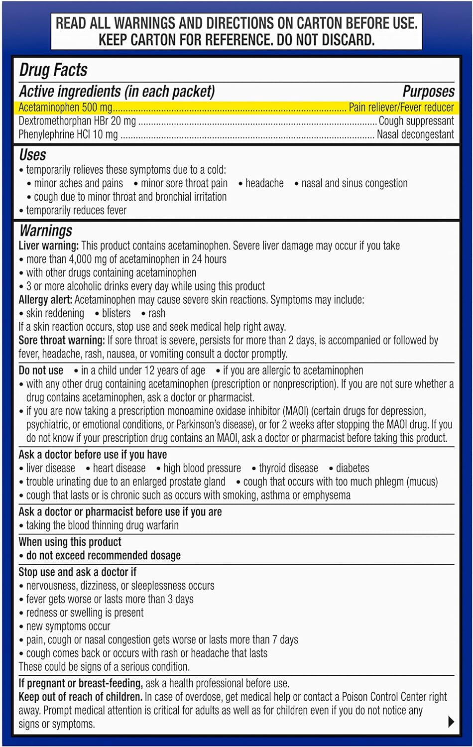 • Each packet contains dextromethorphan HBr 20 mg, acetaminophen 500 mg and phenylephrine HCl 10 mg