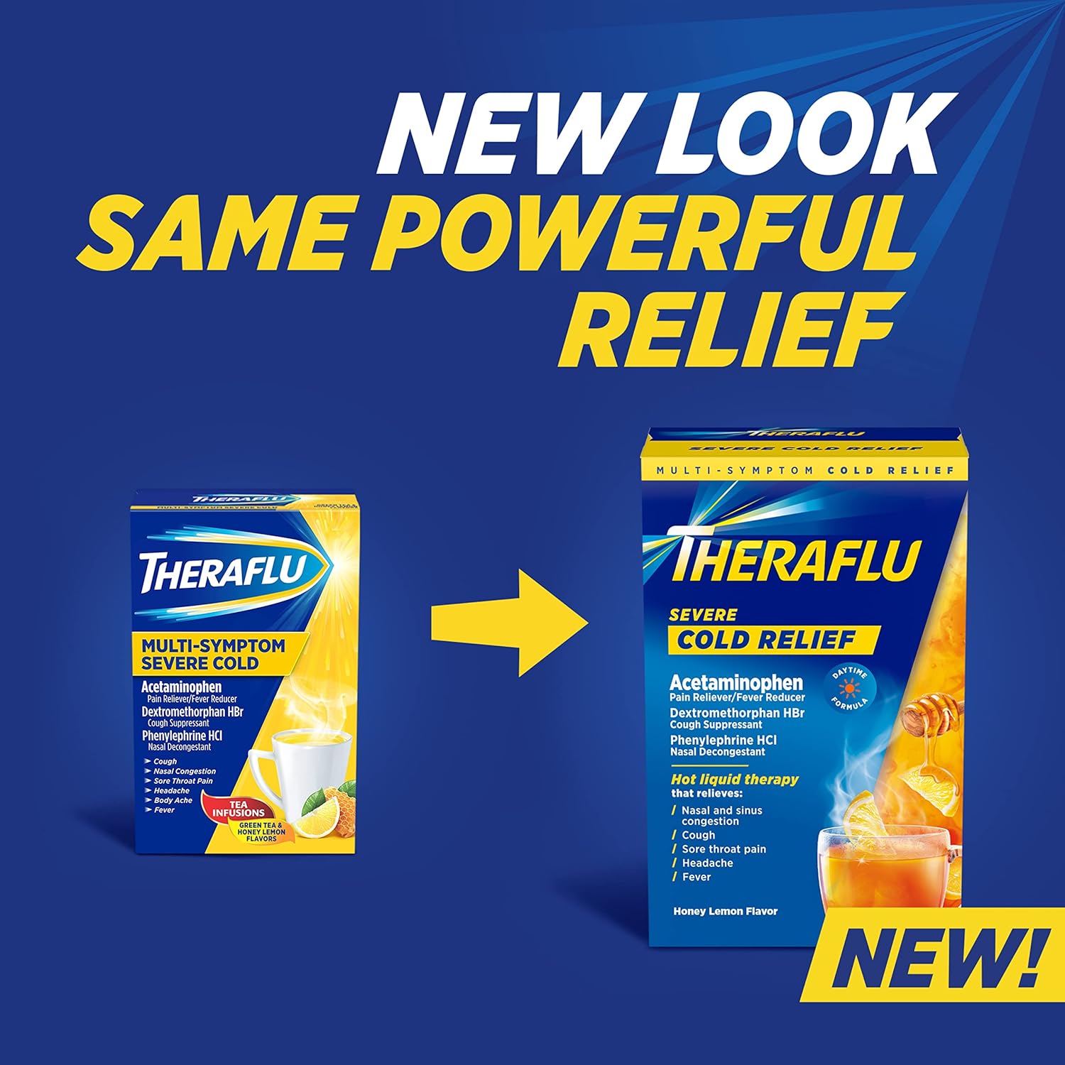 Theraflu Multi-Symptom Severe Cold Medicine helps defeat your worst cold and flu symptoms. Infused with green tea and honey lemon flavors, this Theraflu powder dissolves instantly in hot water to create a comforting yet powerful multi-symptom cold medicine for adults. Every sip of this cough, cold and sore throat medicine provides a warm wave of powerful pain relief, headache relief, cough relief and nasal congestion relief, so you can feel better and move on with your day. Each dose delivers multi-symptom relief through a combination of dextromethorphan HBr, a cough suppressant; acetaminophen, a pain reliever and fever reducer; and phenylephrine HCl, a nasal decongestant. Preparing a hot mug of this Theraflu cold and cough medicine is as easy as making a cup of coffee or tea. Simply dissolve the contents of one of these flu and cold relief packets in 8 ounces of hot water, and drink while warm. Take this cough and cold medicine every four hours as needed for cold and flu symptom relief. Get powerful relief so you can recover with an easy-to-make, soothing cup of Theraflu.