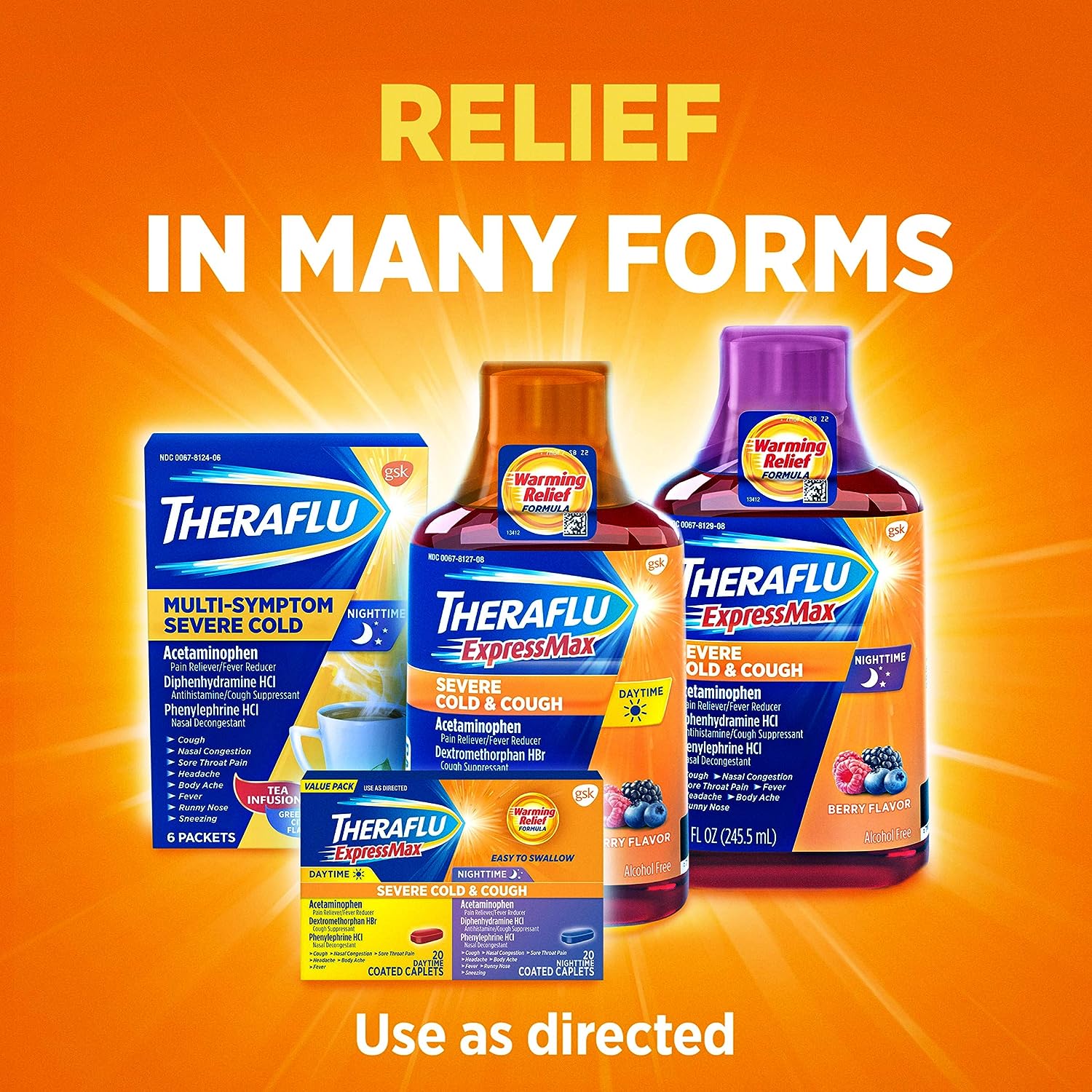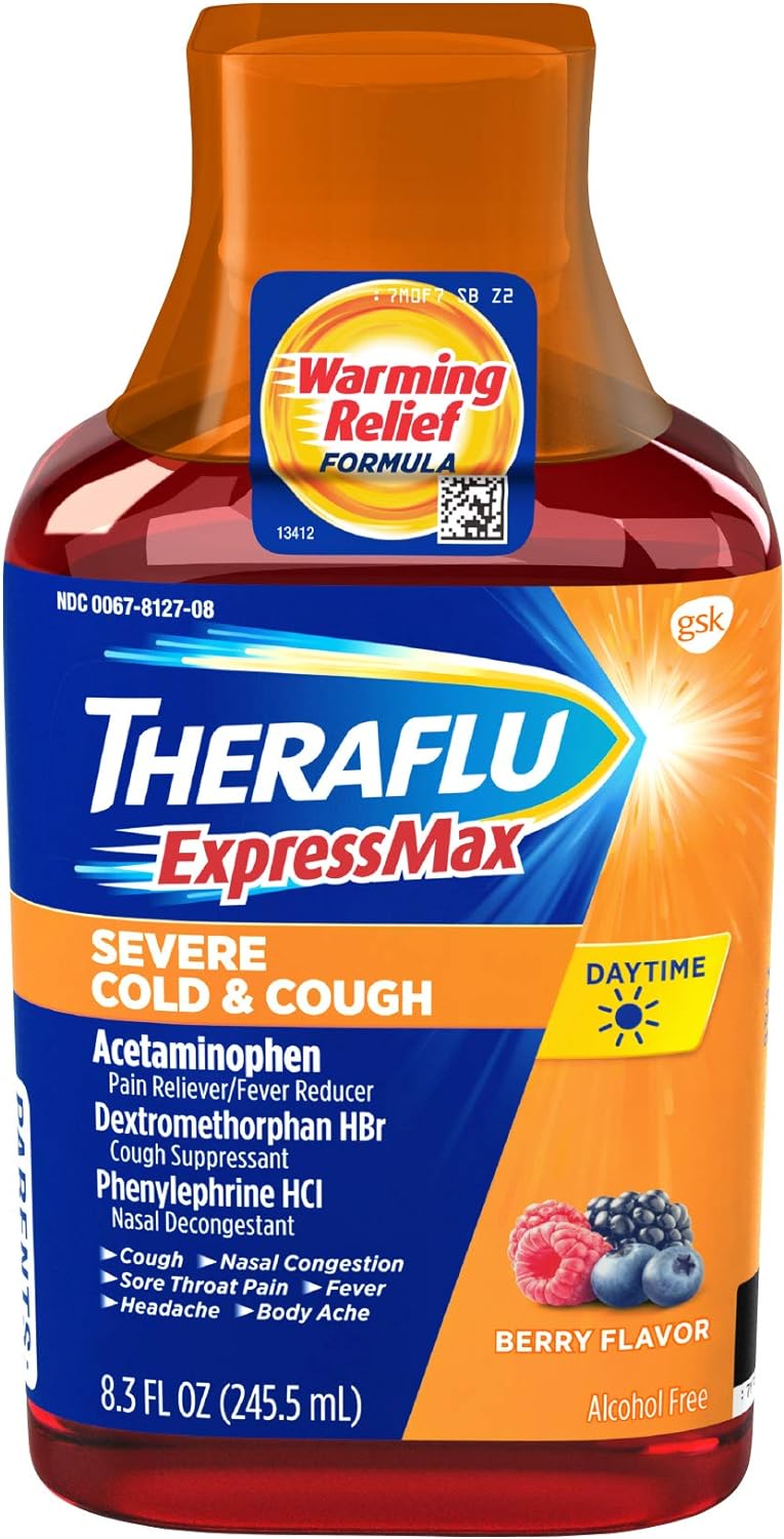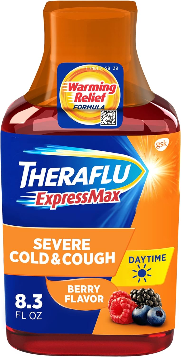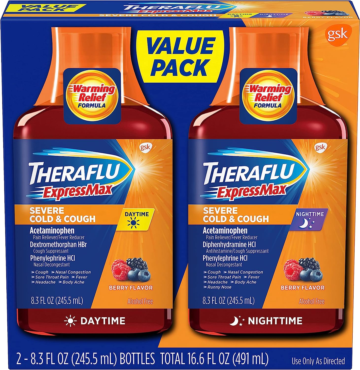 Theraflu ExpressMax Severe Cold and Cough Daytime and Nighttime Cold Medicine delivers serious cold and cough relief with each power-packed dose. Featuring a tasty berry flavor, this nighttime and daytime cough medicine for adults contains prescription-free, maximum strength medications that provide a unique warming sensation with each dose. Theraflu daytime and nighttime cough syrup for adults helps relieve your worst cold symptoms, like headache and body aches, sore throat, nasal congestion, fever and cough. In addition, Theraflu nighttime cold medicine relieves runny nose and sneezing so you can rest easy. Both Theraflu ExpressMax nighttime and daytime cold medicine for adults contain maximum strength medications that deliver fast cold symptom relief, including a nasal decongestant, fever reducer and pain reliever and cough suppressant. Adults and children 12 years and older may take 30mL of either daytime or nighttime severe cough and cold medicine every four hours as needed. Say goodbye to your cold and flu symptoms for good, and get back on your feet with the power of daytime and nighttime Theraflu ExpressMax.
