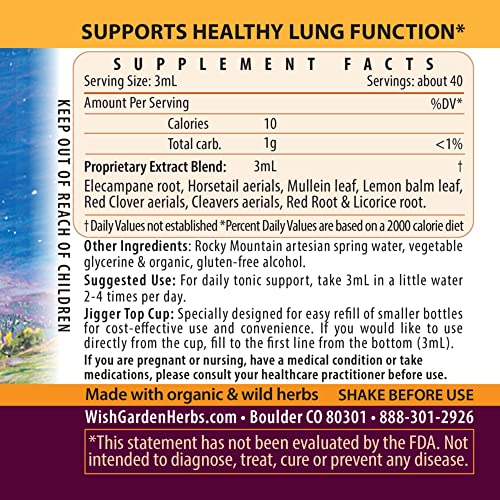 • RADICALLY EFFECTIVE REMEDIES SINCE 1979: We are herbalists, botanists, scientists and naturalists making this respiratory support supplement with mullen leaf herb for lungs the old-fashioned way, using only the cleanest, most vibrant ingredients for optimal potency, efficacy and safety. Woman-owned and family run, WishGarden self-manufactures all of our liquid herbal extracts in Boulder, Colorado.