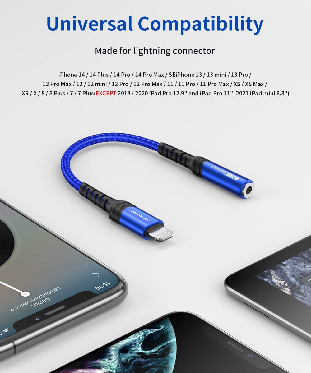 • 【Compatibility List】: JSAUX iphone headphone adapter compatible with most of the Apple devices: iPhone 14/14 Plus/14 Pro/14 Pro Max/SE/13/13 Mini/13 Pro/13 Pro Max/12/12 Mini/12 Pro/12 Pro Max/11/11 Pro/11 Pro Max/XS/XS Max/XR/X/8/8 Plus/7/7 Plus, iPod touches 6th Generation, iPad Mini/iPad Air/iPad Pro. (NOTE: Don't compatible with 2018 iPad Pro 12.9", iPad Pro 11", iPad Mini 2021 which has a USB C port)