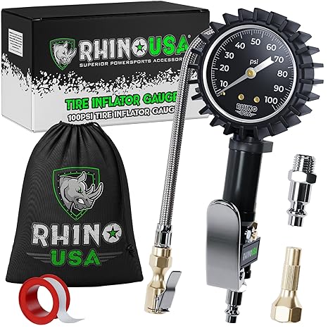 Rhino USA Tire Pressure Gauge with Inflator (0-100 PSI) - Heavy Duty Air Chuck and Compressor Accessories with Stainless Braided Hose, Large Analog Dial and Solid Brass Hardware for Truck and RV