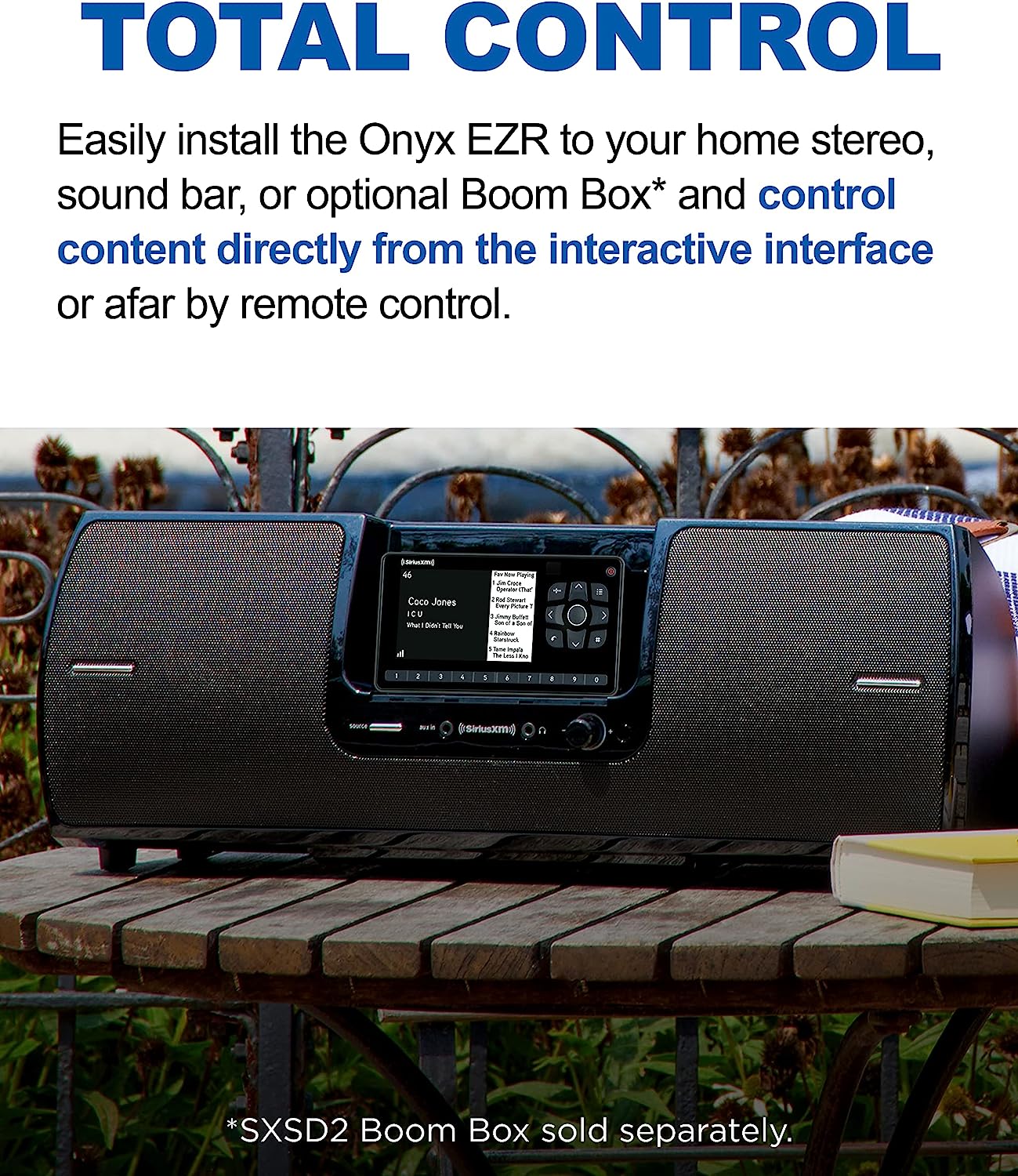 • DIY INSTALLATION - Do It Your SelfThe SiriusXM SXEZR1H1AZ1 Onyx EZR with Home Kit includes a complete home kit for easy home stereo connection and installation. Listen to all of your favorite SiriusXM channels through your powered home speakers with quick, DIY installation