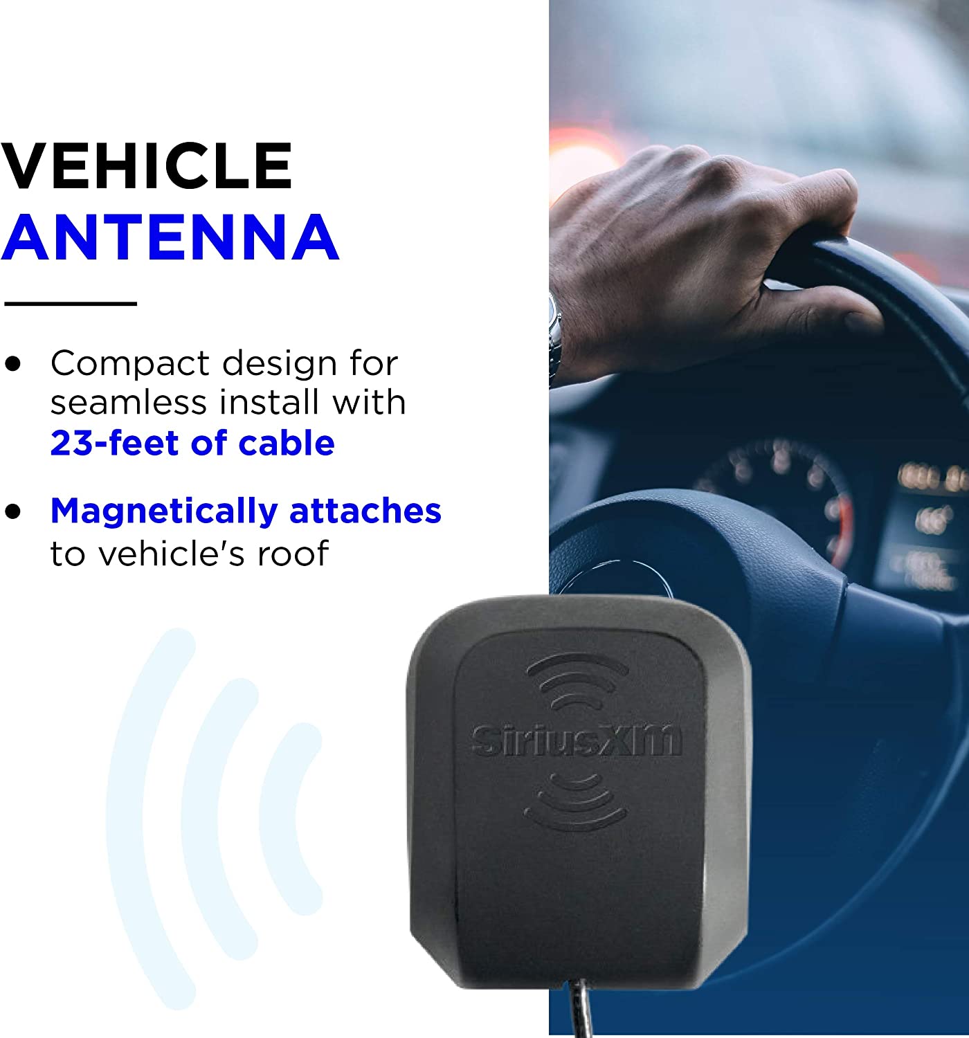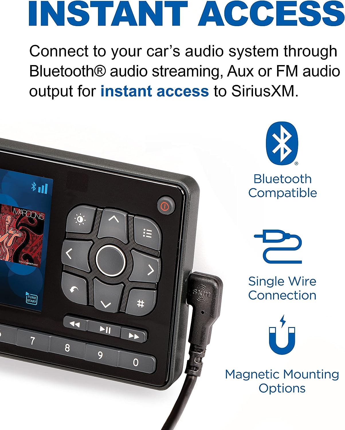 Elevate your listening experience with the SiriusXM® Roady BT In-Vehicle Satellite Radio and enjoy the best in ad-free music, news, sports, talk, and comedy, everywhere on the road; plus, Bluetooth audio streaming in equipped vehicles (3). Personalize and access a variety of premium SiriusXM® content through your existing car audio system or listen through your FM stereo channel (4). View album art, channel logos, and backgrounds; start songs from the beginning with TuneStart™; plus, pause, rewind, and replay live entertainment right from the full-color, high-resolution 3.2" display, featuring day and night settings for screen brightness control. Save up to 20 of your favorite channels for one-button access, including on-demand shows, live sports, Pandora stations, 100+ Xtra Channels (1), and more, plus receive real-time alerts when your favorite song, artist, or sports team (2) plays on SiriusXM® so you never miss a beat. Install and connect in minutes with the included magnetic vent or dash mount, or another compatible magnetic mounting solution (sold separately) along with the one-cable connection to the radio display. For more ways to listen, you can connect to your car’s audio system via Bluetooth audio streaming (3), Aux, or FM audio (4) output. The SiriusXM® Roady BT In-Vehicle Satellite Radio comes with everything you need to install and enjoy SiriusXM® content on your car stereo, including the SiriusXM® Roady BT display and cable, intelligent power adapter, 3.5mm aux audio cable, magnetic adapter, vent and dash mounts, and magnetic mount antenna. Subscription sold separately by SiriusXM®. (1) Pandora Stations, Xtra Channels, and On Demand require internet connectivity via a Wi-Fi connection. (2) Access to Game Alerts depends on subscription plan. (3) Requires vehicle’s audio to support Bluetooth® streaming audio. Streaming content requires internet connectivity via a Wi-Fi connection. (4) With optional FMDA25 adapter (sold separately).