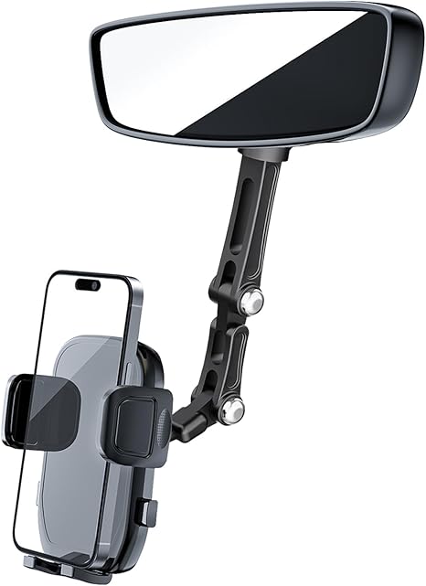 Rear View Mirror Car Phone Holder Mount with Metal Body, Rotatable and Retractable Adjustable Aluminum Alloy Rearview Cell Phone Holder Cradle Stand for Car Fit with All 4-7 inches Smartphones