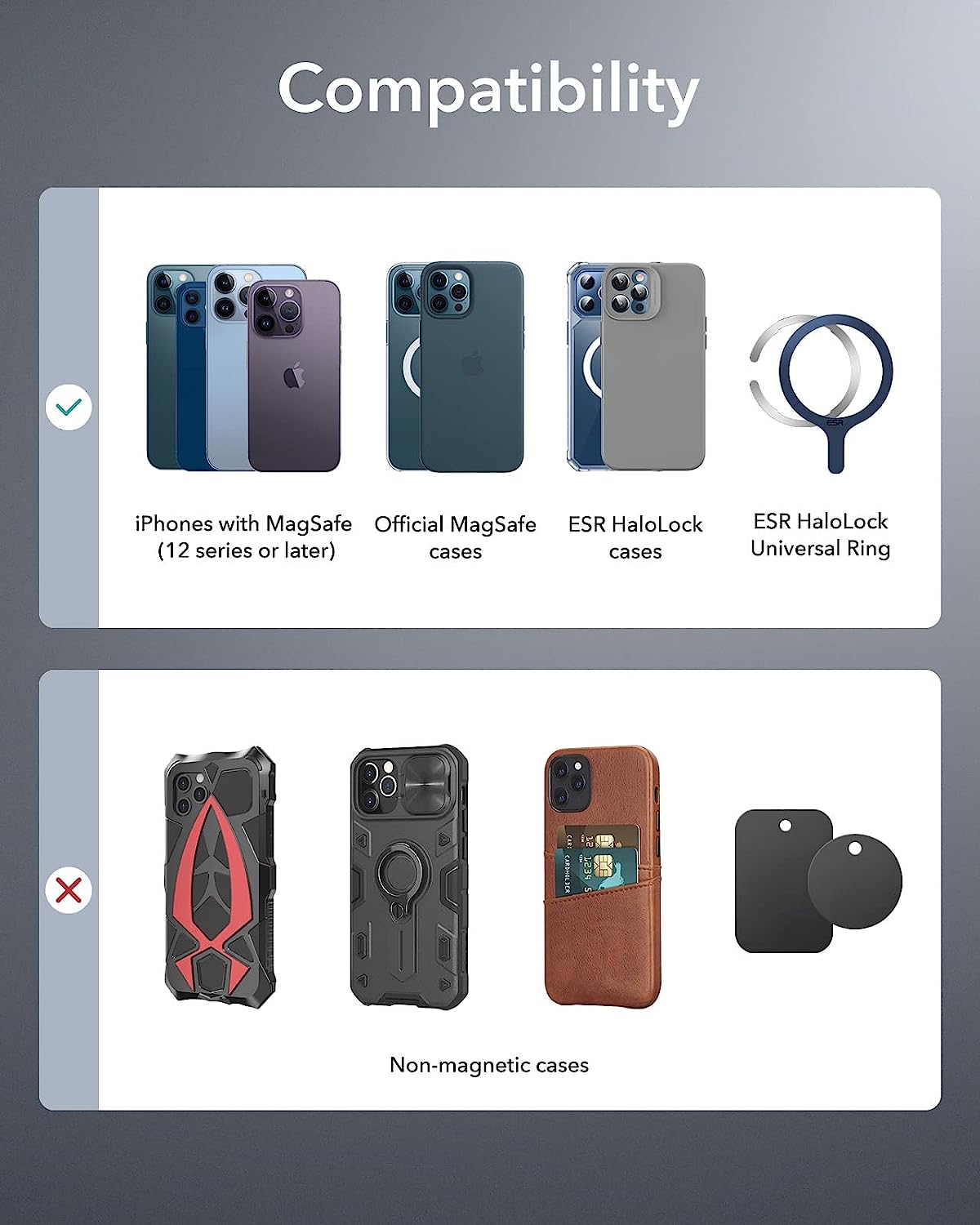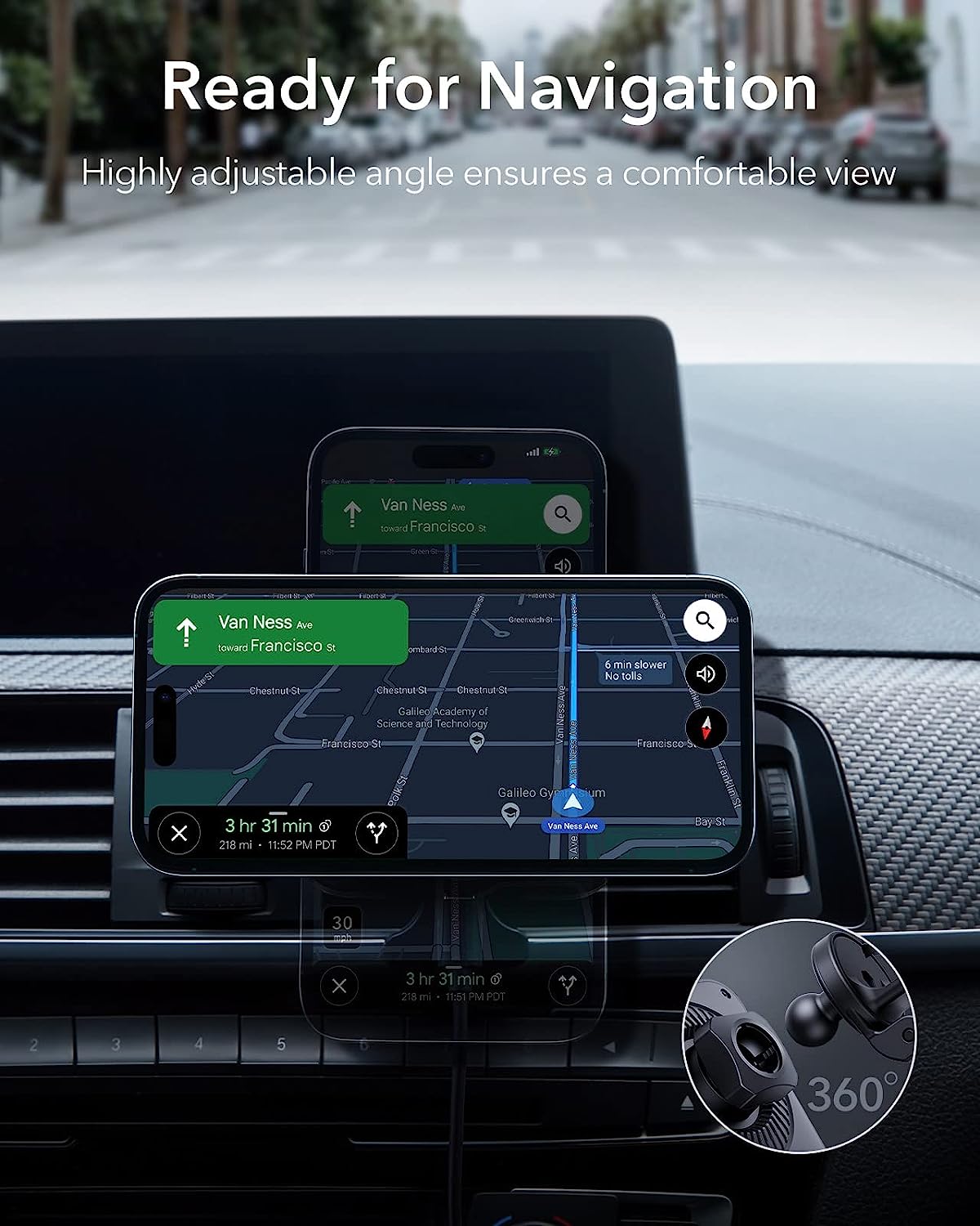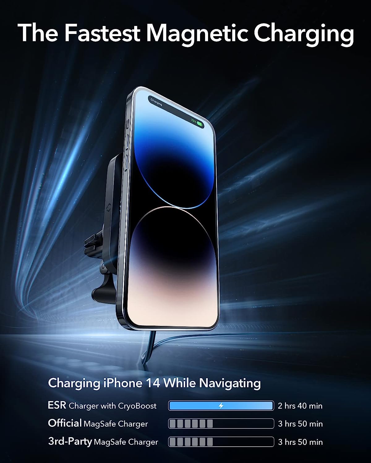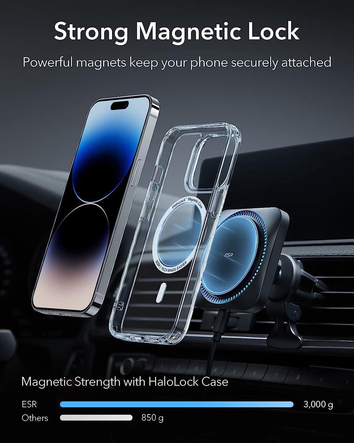 • Secure Magnetic Lock: powerful magnets with 1,400 g of holding force and a non-slip silicone ring keep your phone securely in place, even when driving on bumpy roads; an official MagSafe case or ESR HaloLock case is recommended for rough terrain