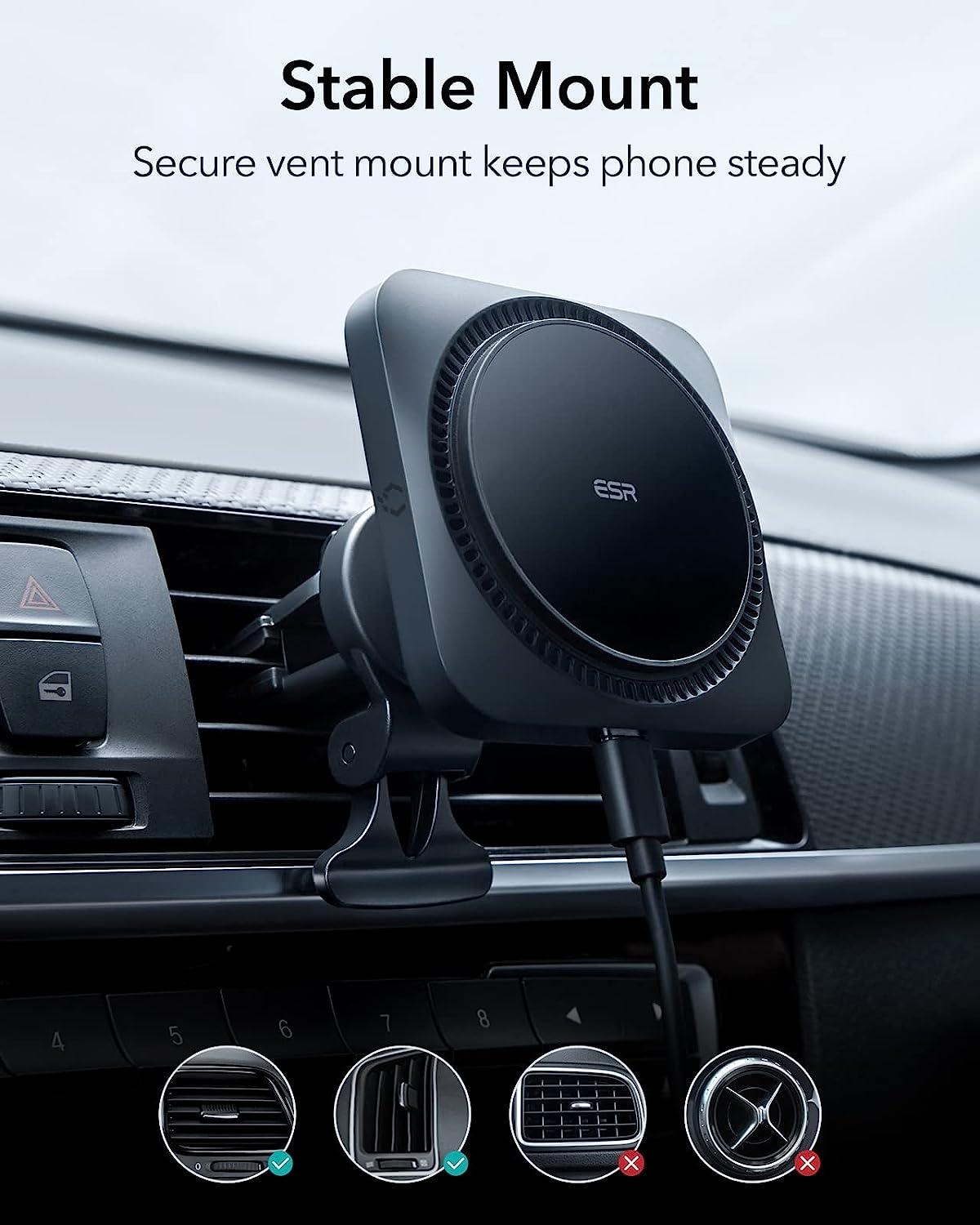 • Stable Vent Mount: strong vent clip and support arm provide enhanced mounting stability