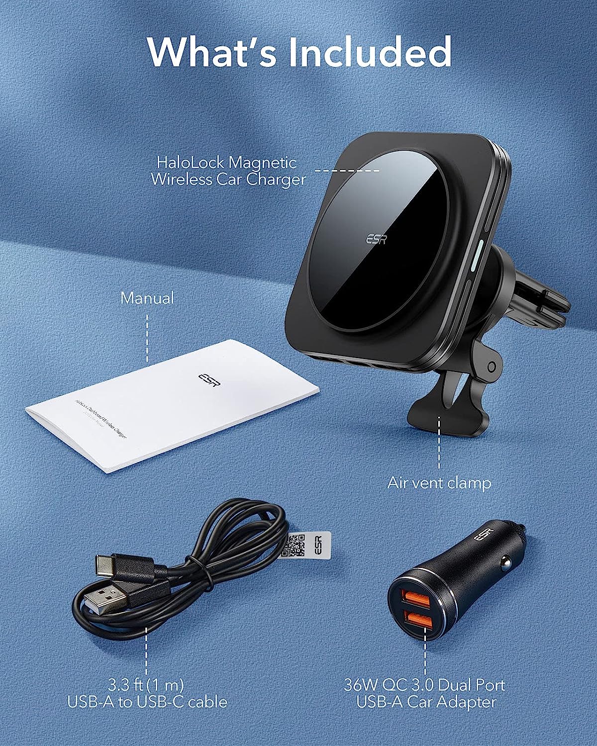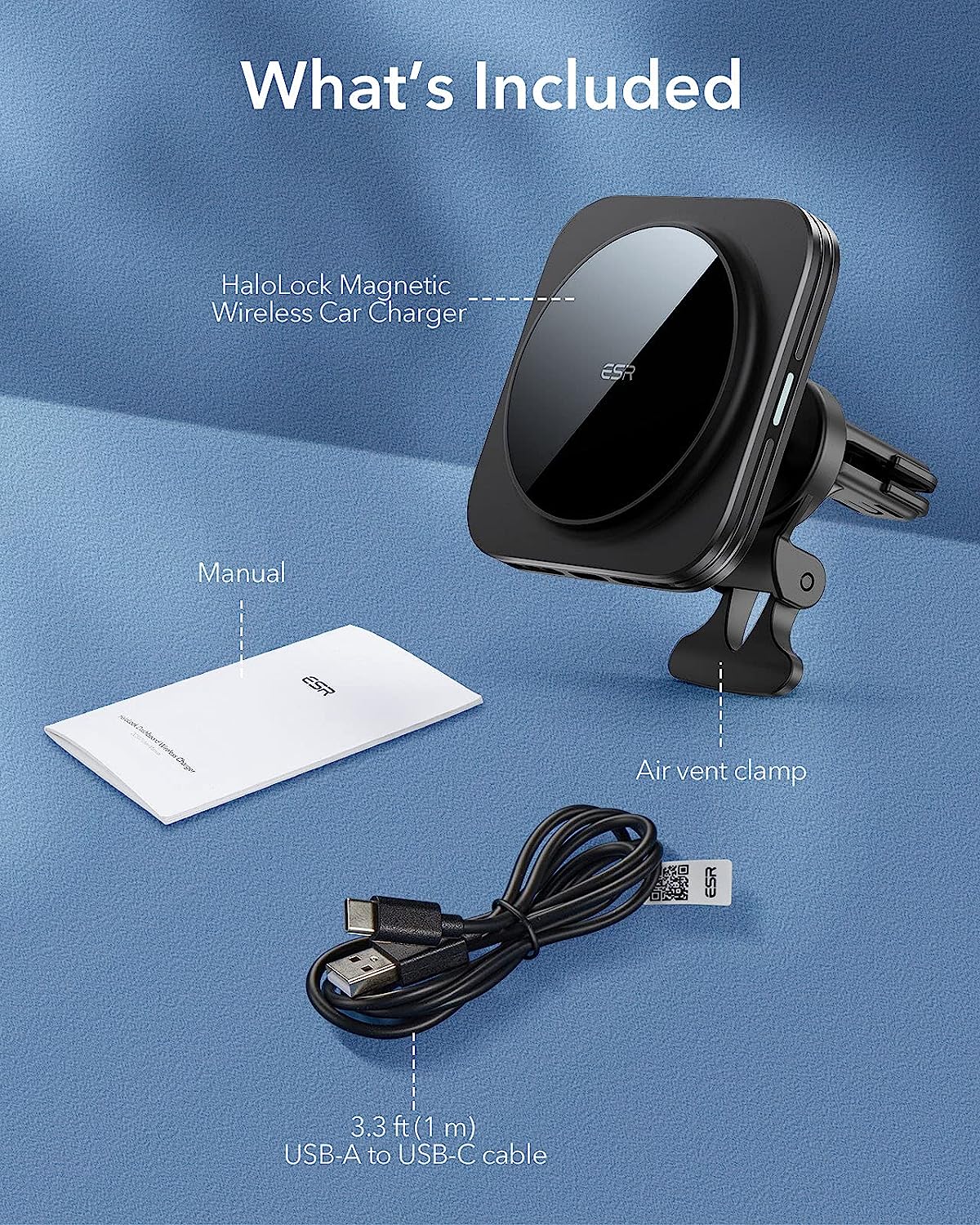 • What's Included: HaloLock Magnetic Wireless Car Charger, air vent clamp, 3.3 ft (1 m) USB-A to USB-C cable, and manual; car charging adapter not included; ONLY compatible with iPhone 14/13/12 series phones
