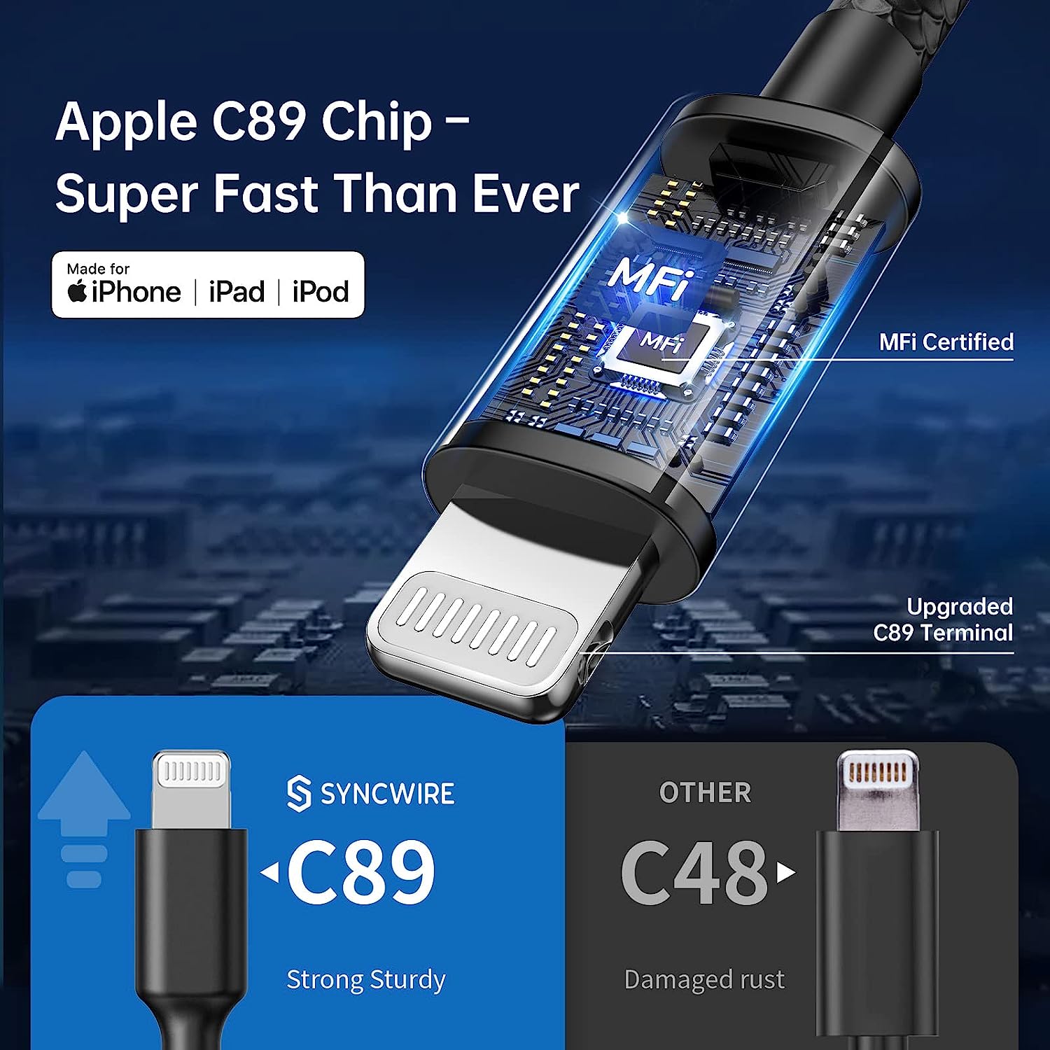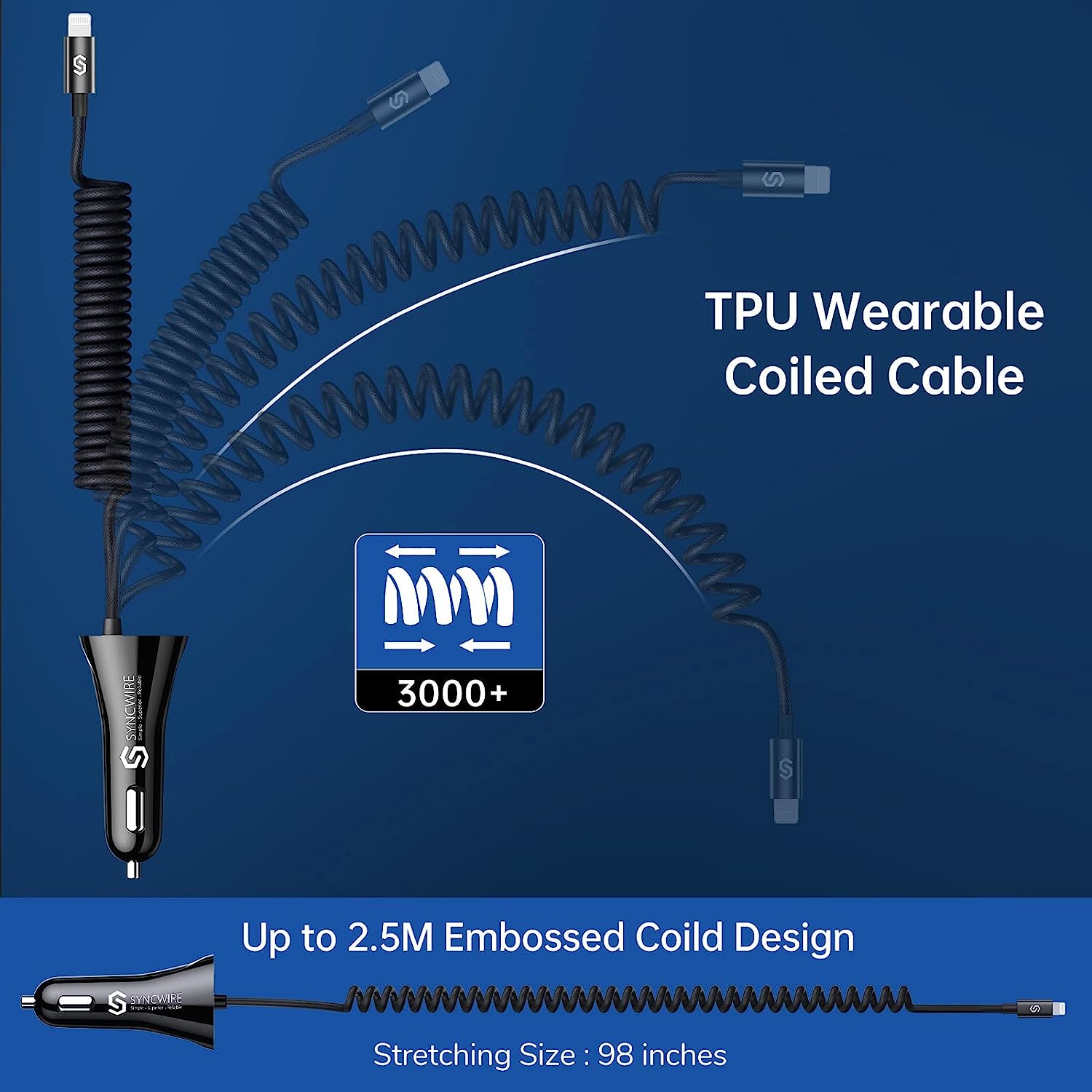 • I-smart design - the combination of lightning cable and additional USB port allows Syncwire Lightning car charger Charge any two devices simultaneously with max up to 4.8a output, and it automatically adapts the output to each one accordingly.