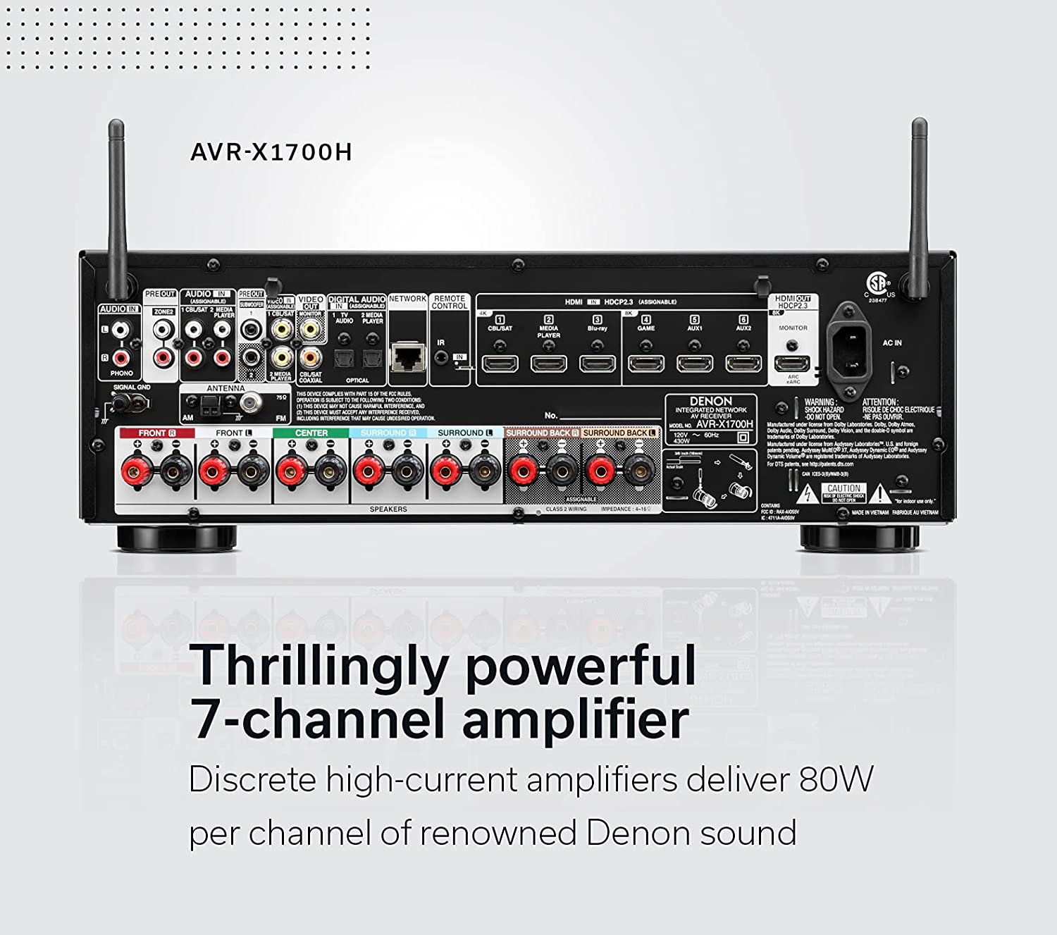 Denon AVR-X1700H 7.2 Channel AV Receiver - 80W/Channel (2021 Model), Advanced 8K HDMI Video w/eARC, Full 3D Audio - Dolby Atmos, DTS:X, Wireless Streaming, Built-in HEOS, Amazon Alexa Voice Control