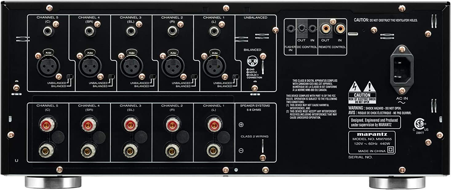 The MM7055 power amplifier is ideal for a “5.1” home theater system, whether based on a moderately powered receiver or a surround sound processor. This 5-channel amplifier rated at 140 watt per channel into 8 ohms is capable of long-term power delivery into low impedance speakers. Equipped with an El-core transformer and LAPT (high efficiency power transistor) the unit boasts a massive power supply, which coupled with current feedback circuitry delivers powerful sound with astounding musical accuracy. All output stages feature identical topology for uniform high-quality sound across all channels, and the MM7055 lets you choose between balanced (XLR) and unbalanced (RCA) inputs for each channel, for maximum system configuration flexibility. For more complex home theater systems, pair MM7055 with one or more MM7025s for an immersive 7.1 or 9.1 audio experience.