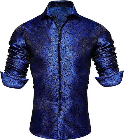 Barry.Wang Men Shirts Silk Paisley Dress Shirts for Men Blue Long Sleeve Woven Floral Casual Button Down