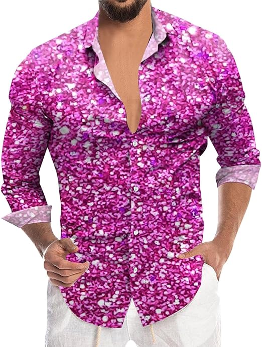 Mens Mardi Sequin Fashion Digital 3D Printed Long Sleeve Lapel Button Down Shirt Top Mens Polyester Spandex Shirt (XXXL)