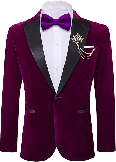 Barry.Wang Velvet Mens Blazer Peaked Lapel Sport Coat Brooch Slim Fit Tuxedo One Button Suit Jacket Wedding Dinner