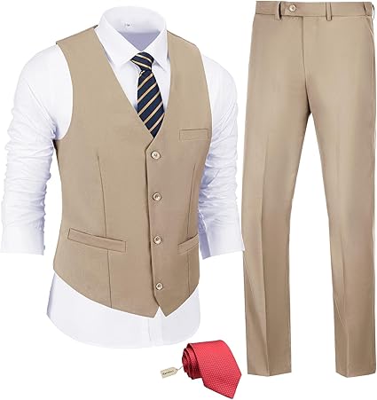 Men's 2 Piece Slim Fit Suit Set, Solid Vest and Pants Suit for Men with Tie