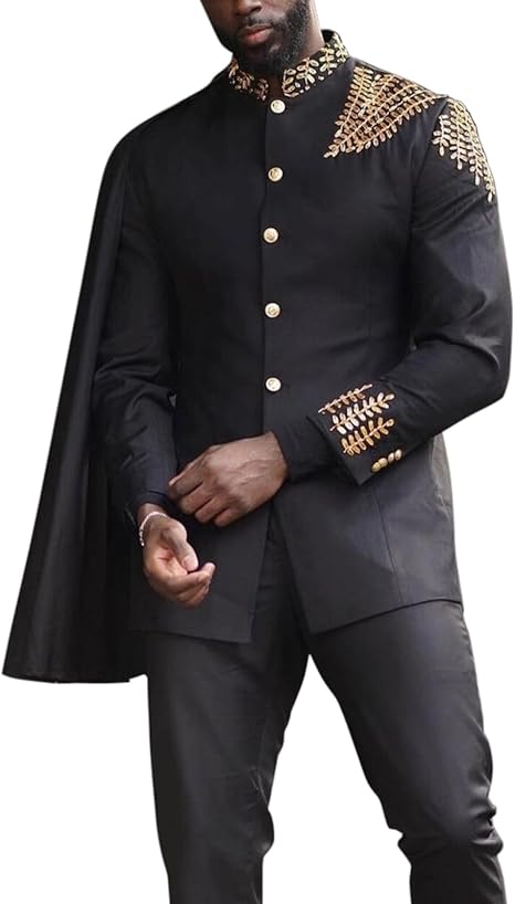 African 3 Piece Suit for Men Embroidered Tuxedo Set Slim Fit Prom Graduation Party Jacket Pants with Detachable Cape