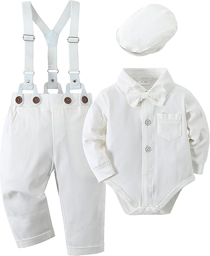 YALLET Baby Boy Clothes Set Infant Tuxedo Long Sleeve Gentleman Suit Outfits + Beret Hat + Suspender Pants + Bowtie 0-18M