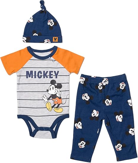 Disney Mickey Mouse Pluto Donald Duck Baby Bodysuit Pants and Hat 3 Piece Outfit Set Newborn to Infant