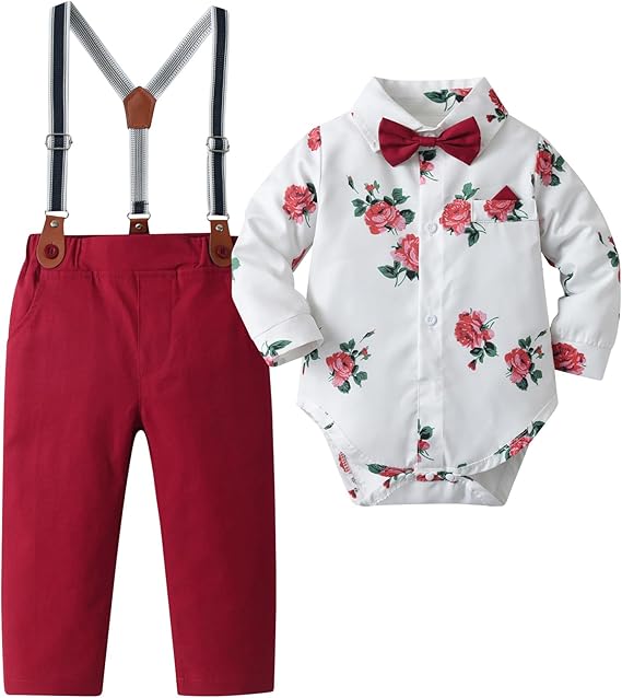 Baby Boys Pants Sets, Infant Long Sleeve Shirt + Pants + Bow Tie + Suspenders, Toddler Gentleman Outfits