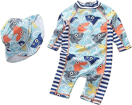 Baby Boys Toddler Long Sleeve One Piece Swimsuit Bathing Suit with Sun Hat Rash Guard Surfing Suit UPF 50+ 3 Months-4 Years