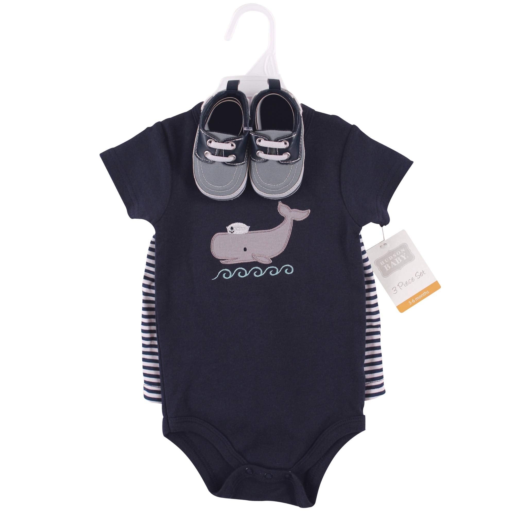 Details: Hudson Baby Unisex Baby Cotton Bodysuit, Shorts and Shoe Set