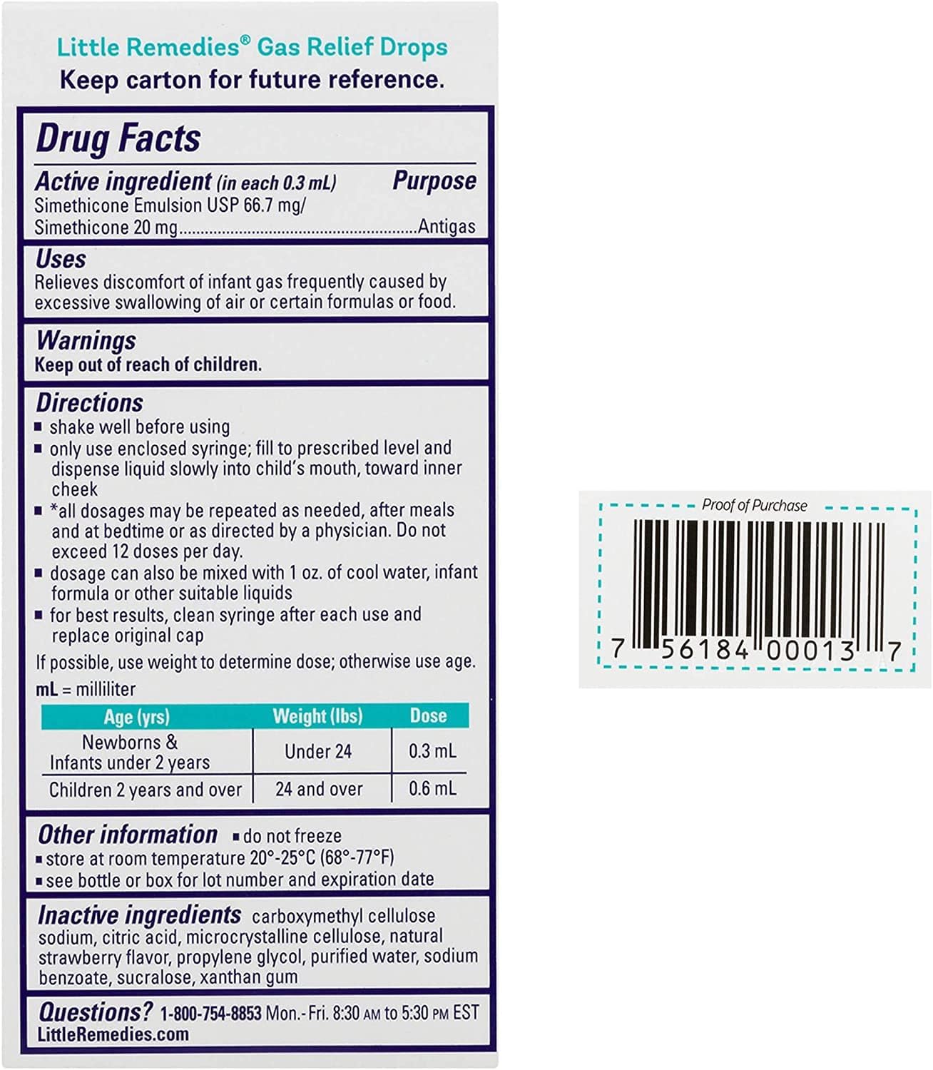 Little Remedies Gas Relief Drops is made especially for babies to gently and reliably relieve tummy pain from excess gas. Little Remedies Gas Relief Drops with simethicone help break down the gas bubbles in baby’s tummy and can provide relief from gas in minutes. The drops can easily be administered orally or mixed in formula or water up to 12 doses a day. Little Remedies Gas Relief Drops is Pediatrician Recommended, and contains no artificial flavors, dyes, or alcohol. As a parent, it’s the little things that matter. Your baby’s little giggles, little steps, and little sniffles. Being there with a little hug and a little song. Loving touches and attention to detail go into everything you do. Little things matter to us too. Little Remedies designs safe and reliable solutions just for babies. We pay attention to little details, like ensuring our products are free from parabens, artificial flavors, and dyes. To help your baby stay happy and healthy, we make sure they have everything they need. And nothing they don't.