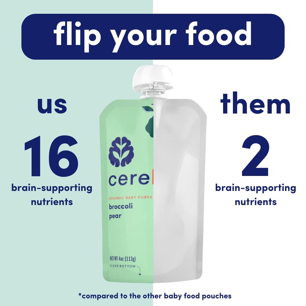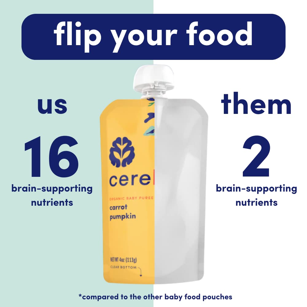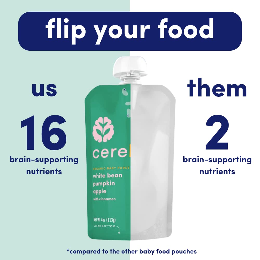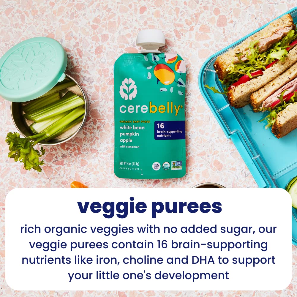• SUPPORTS COGNITIVE DEVELOPMENT - Cerebelly pouches are the only organic fruit pouch (and veggie pouch) that delivers 16 key brain-supporting nutrients studied by our founder. A downright delicious blend high in Iron, Copper, Folate, and Choline that helps your little one’s brain manage speech and supports the development of their visual processing. Other veggie pouches for toddlers and regular baby formula lack the quality brain nutrients we know your growing baby needs!