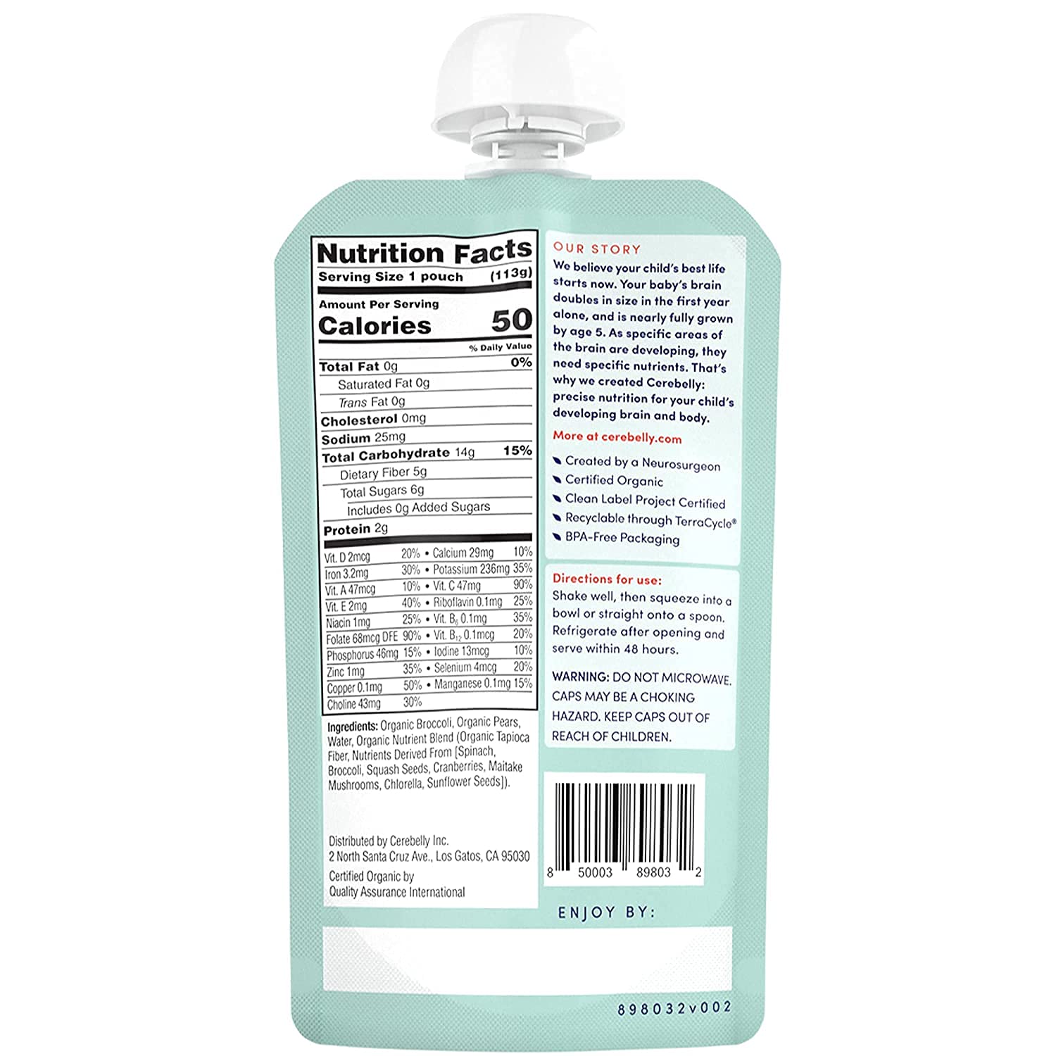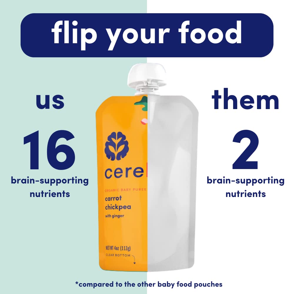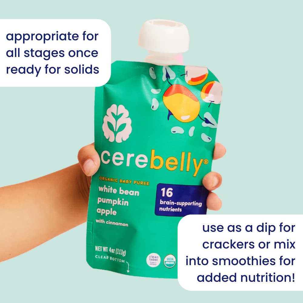• SUPPORTS COGNITIVE DEVELOPMENT - Cerebelly pouches are the only organic fruit pouch (and veggie pouch) that delivers 16 key brain-supporting nutrients studied by our founder. A downright delicious blend high in Iron, Copper, Folate, and Choline that helps your little one’s brain manage speech and supports the development of their visual processing. Other veggie pouches for toddlers and regular baby formula lack the quality brain nutrients we know your growing baby needs!