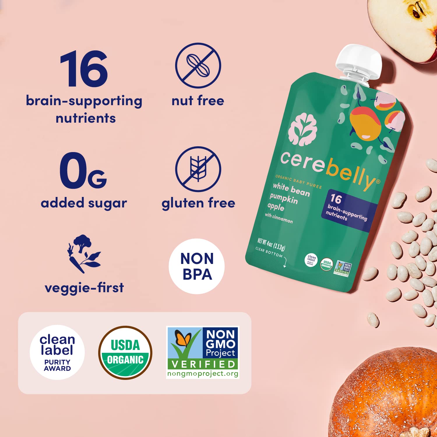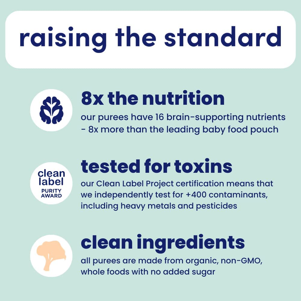 • CLEAN LABEL AWARD SO PARENTS DON'T HAVE TO WORRY - Our toddler food pouches are Clean Label certified. We test for harmful levels of heavy metals and toxins to make sure you are feeding your little one only the highest quality baby food purees. Other companies' toddler snacks and toddler meals may fall short of testing, but Cerebelly is actually the first shelf-stable baby food to receive the Clean Label Project Purity Award. We are raising the bar for organic baby food!