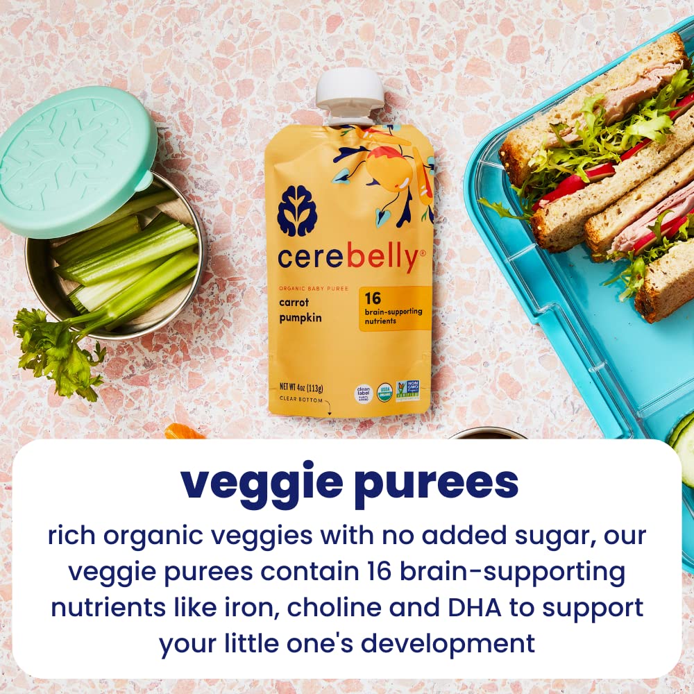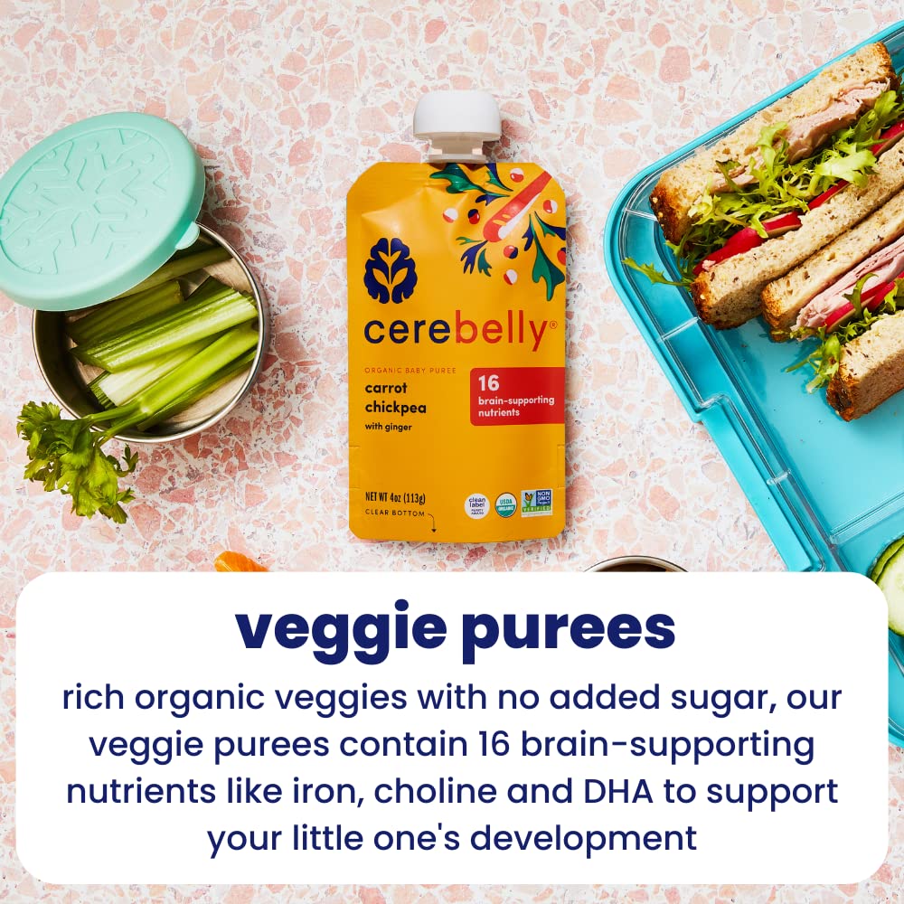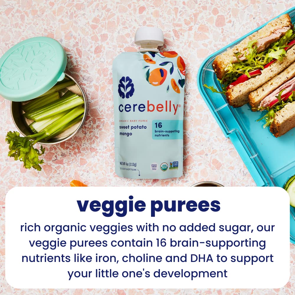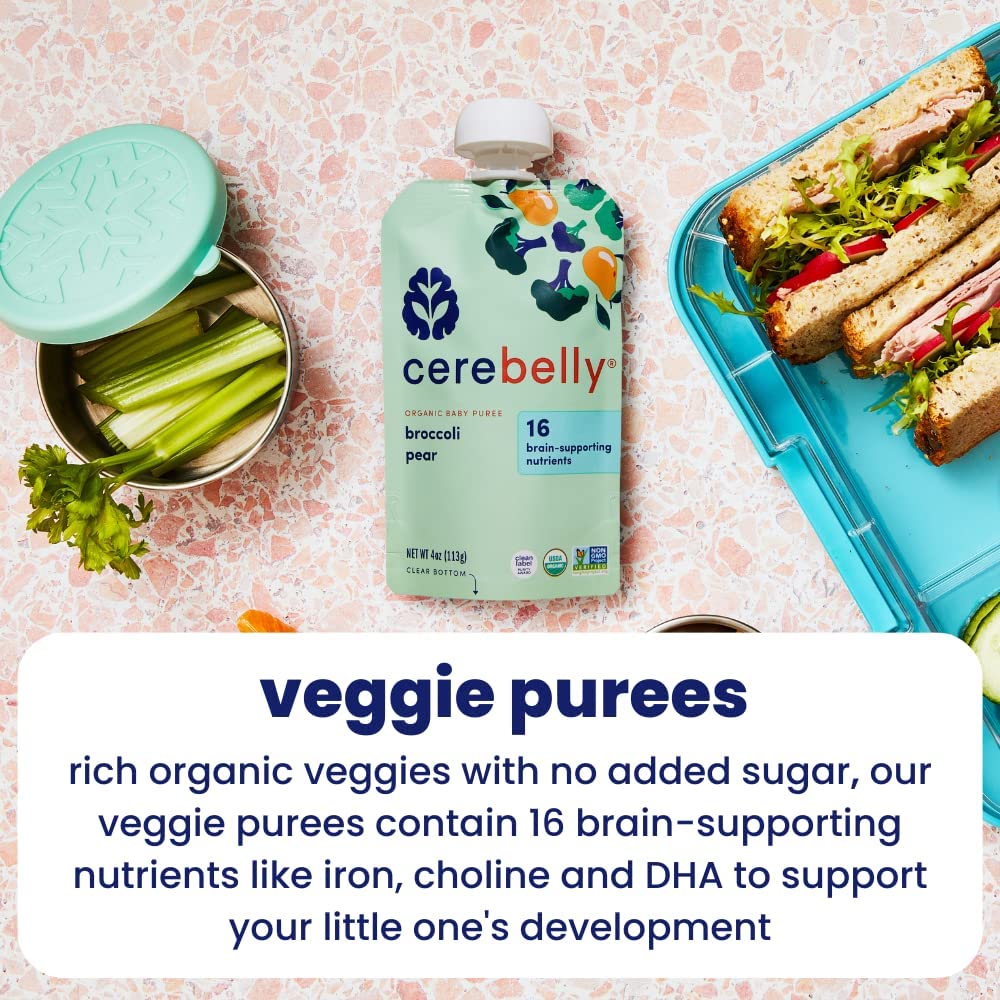 Cerebelly Baby Food Pouches - Organic Veggie Purees Variety Pack (4 oz, Pack of 8) Toddler Snacks - 16 Brain-supporting Nutrients - Healthy Snacks, Gluten-Free, BPA-Free, Non-GMO