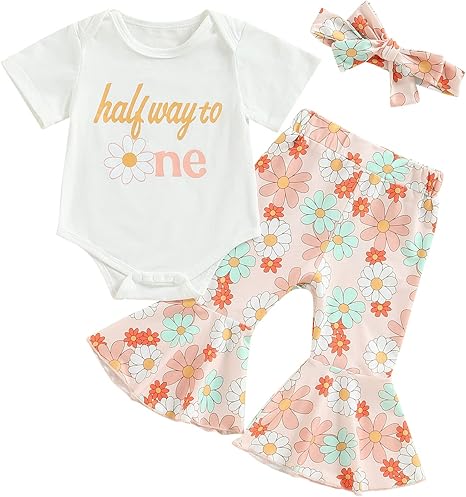 Baby Girl Half 1st 2nd Birthday Outfit Short Sleeve Romper/Shirt Top Floral Bell Bottoms Pants Birthday Girl Outfit